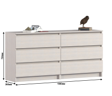 Комод с ящиками выполнен из ЛДСП: прочного и долговечного материала, который устойчив к механическим повреждениям. Мебель дополнена шестью вместительными ящиками, надежными механизмами открывания, а отсутствующие ручки делают модель более органичной и лаконичной.
