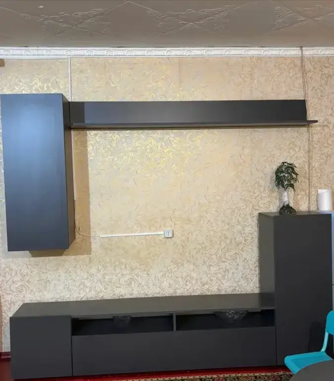 В состав стенки входит: тумба под телевизор с открытыми полками для видео, аудио аппаратуры и отделениями с непрозрачными дверцами, открытая полка для демонстрации коллекции декоративной посуды или памятных сувениров, закрытые модули для книг, посуды..