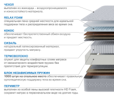 Наполнитель: вязкоэластичный ППУ, сизаль 10 мм, латексированная кокосовая плита 10 мм, термовойлок, латексированная кокосовая плита 20 мм, ячеистая пена с эффектом микромассажа.