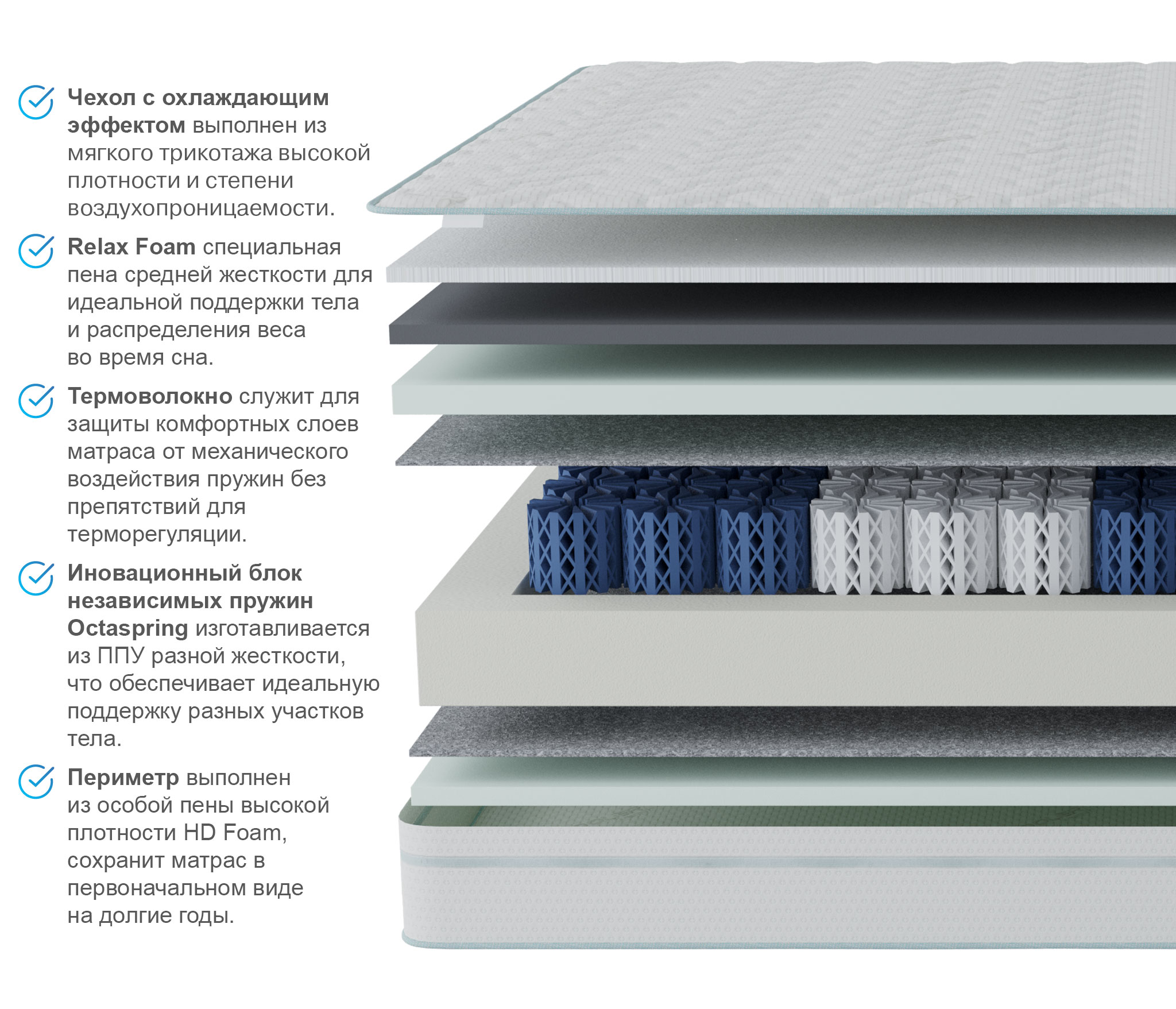 В основе матраса пенные пружины Octaspring высотой 10 см, что позволяет максимально ощутить мягкую динамичность пружины и ее индивидуальную работу. За счет этого увеличивается фаза глубокого сна и значительно снижаются нежелательные пробуждения, влияющие на восстановление организма.