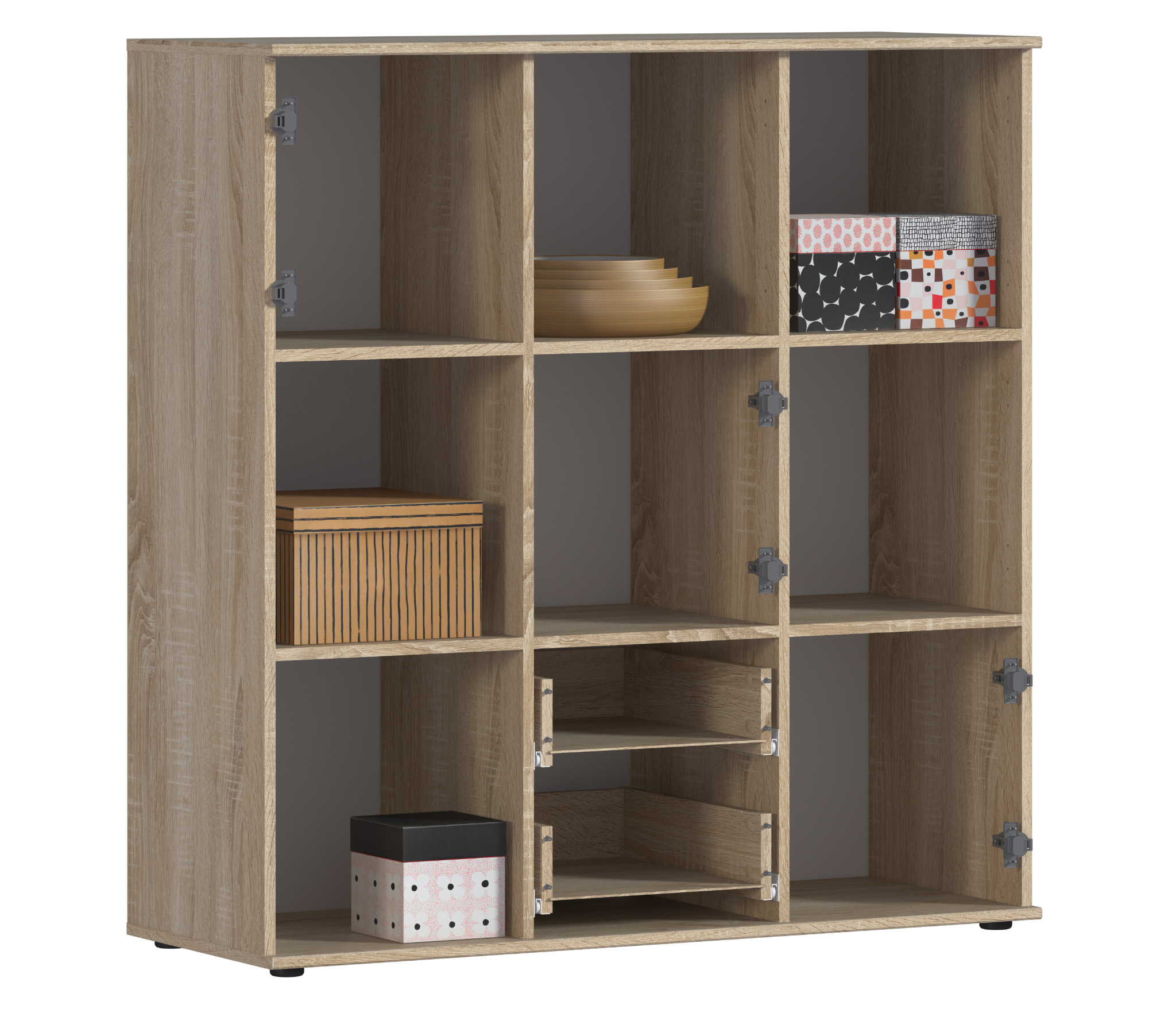 Стеллаж Мамбо СБ-2794 идеально подходит для решения вопроса, связанного с хранением целого ряда вещей – книг, журналов, посуды, памятных сувениров, предметов для рукоделия и т.д. Он может быть элементом модульной системы Мамбо, а может рассматриваться как автономный предмет мебели.¶Габаритные размеры – ширина 117 см, высота 121 см, глубина 44 см. Визуально стеллаж разделен на девять одинаковых отделений: пять открытых отделений, три отделения с дверцами и одно отделение с двумя выдвижными ящиками.