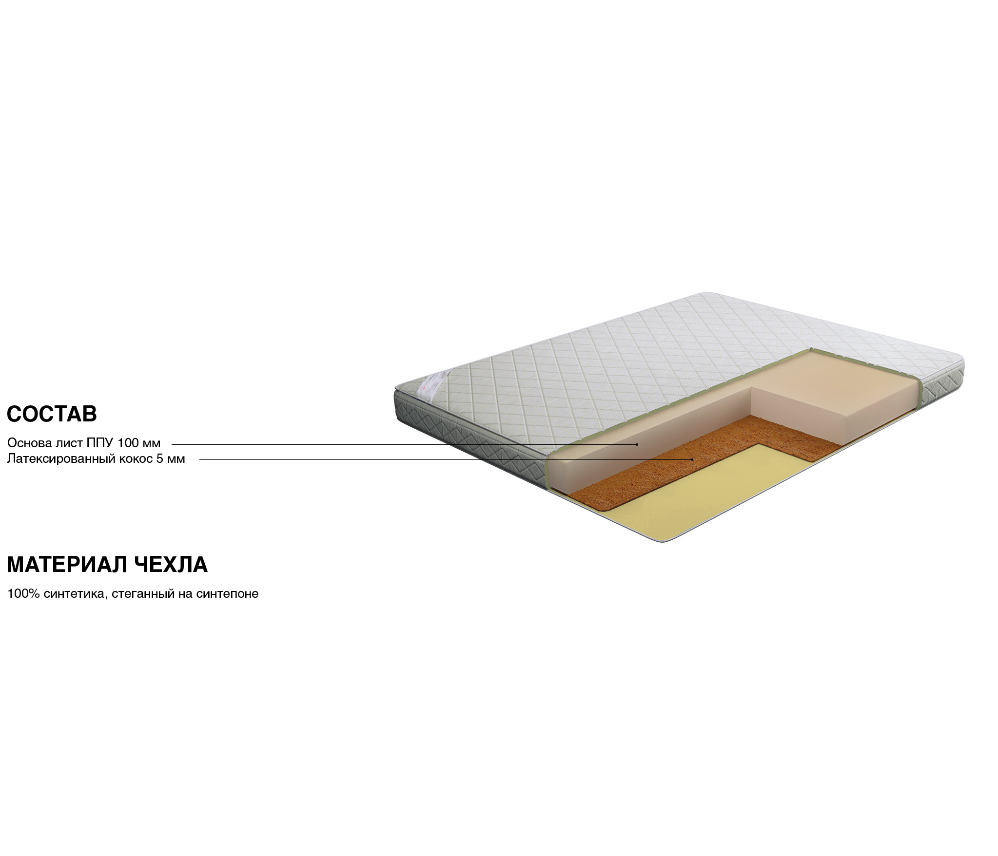 Классическое сочетание упругой и прочной пены с натуральным кокосовым листом, делают этот матрас универсальным и бюджетным решением для спальных мест с не высокой нагрузкой. Матрас подойдет для кроватей с невысоким бортиком. Обращаем ваше внимание, что матрас отвечает за здоровье нижнего и среднего отделов позвоночника, а за шейный отдел отвечает правильно подобранная ортопедическая подушка. Рекомендуем использование матраса с защитным чехлом аквастоп.