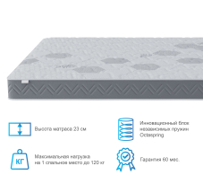 В основе матраса пенные пружины Octaspring высотой 10 см, что позволяет максимально ощутить мягкую динамичность пружины и ее индивидуальную работу. За счет этого увеличивается фаза глубокого сна и значительно снижаются нежелательные пробуждения, влияющие на восстановление организма.