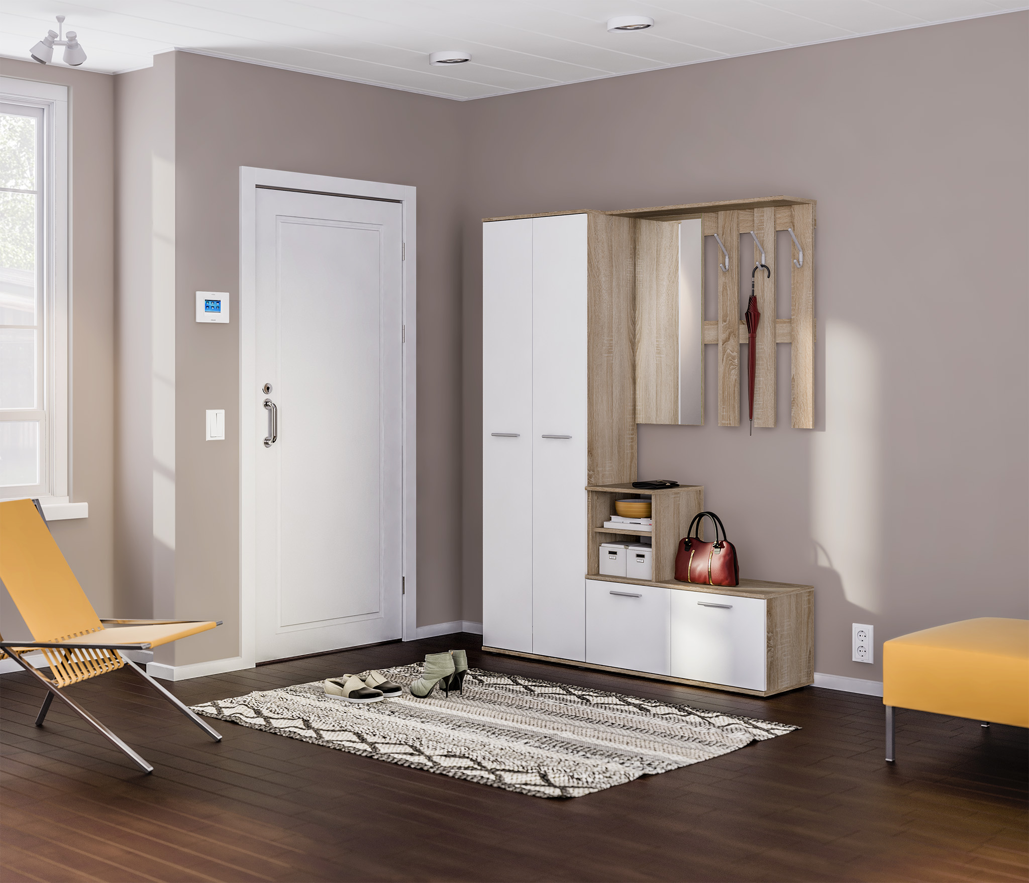 Выполнен шкаф из современного и качественного материала КДСП. Внешняя отделка комбинированная – корпус в цвете «Дуб Сонома», фасады чисто белые.