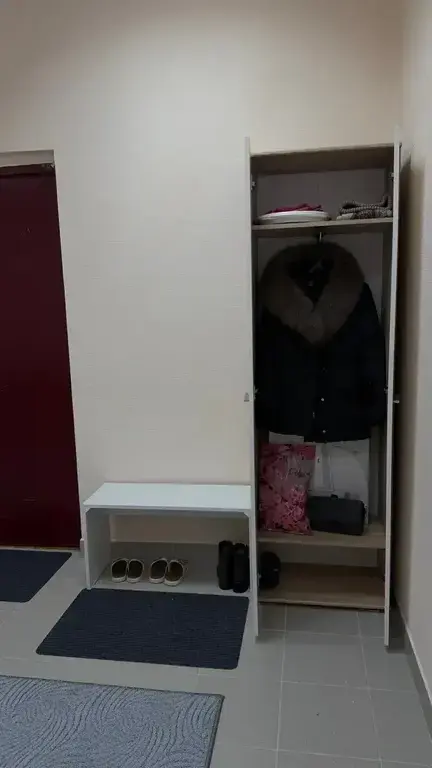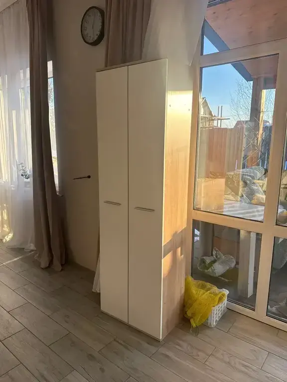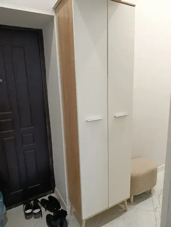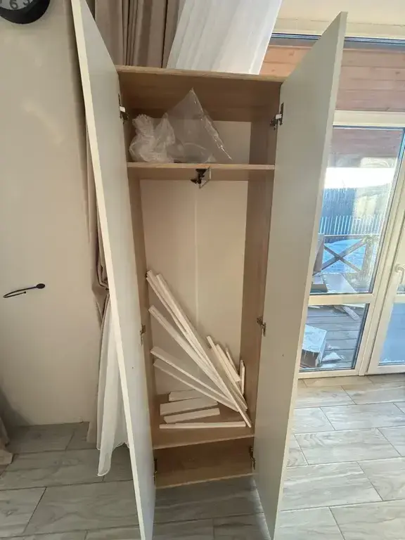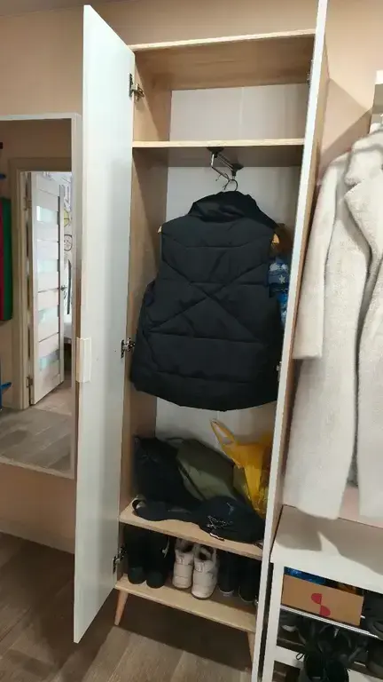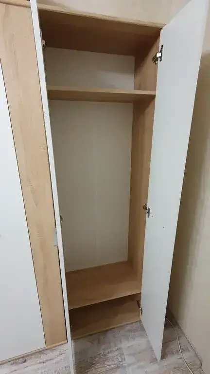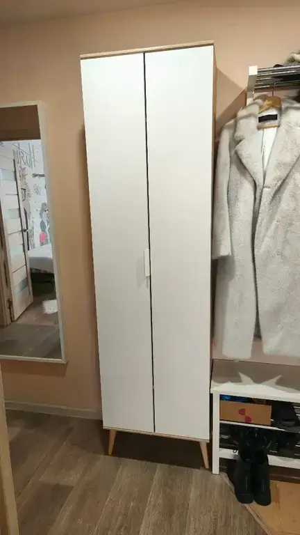 Шкаф имеет одно вместительное плательное отделение со штангой, над которым расположена антресоль. Также внизу расположено отделение для хранения обуви Габаритные размеры шкафа – ширина 59 см, высота 191 см и глубина 35 см.