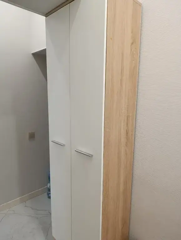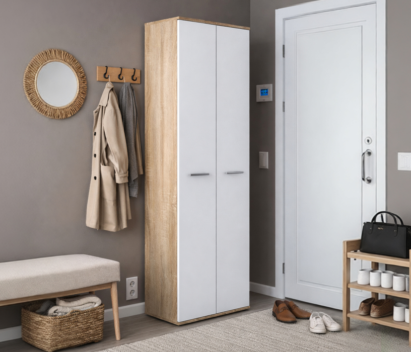 Выполнен шкаф из современного и качественного материала КДСП. Внешняя отделка комбинированная – корпус в цвете «Дуб Сонома», фасады чисто белые.