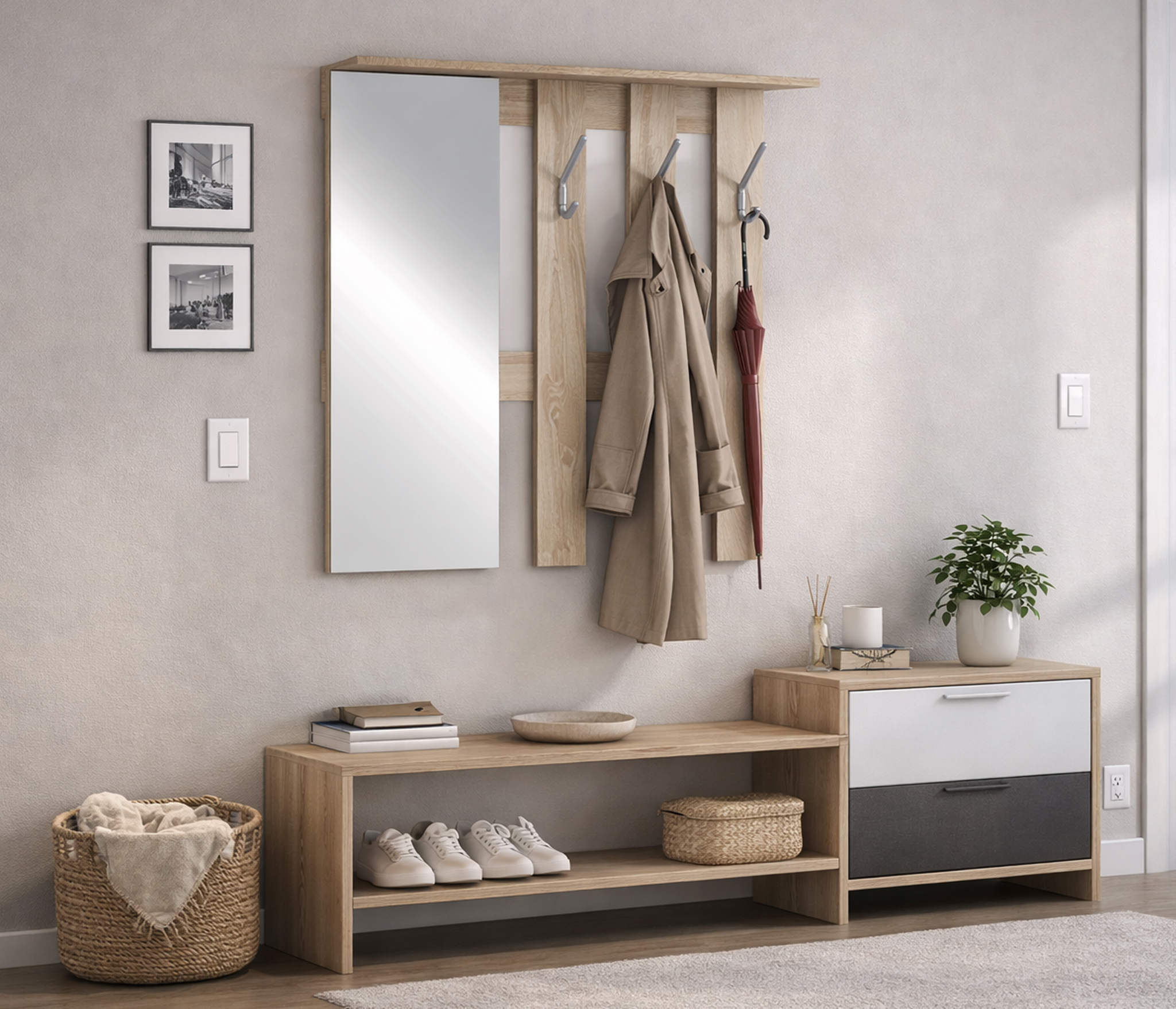 Проблема как и у всех, заявлено зеркало с левой стороны, на фото и инструкции зеркало с левой стороны, по факту крепежные отверстия только для зеркала справа. Итог видно на фото. Ещё одним недостатком является комплектное крепление на стену, целый день крутил и так и сяк, вешалка на нем висит на стене очень хлипко. В итоге повесил на петли от старой вешалки.