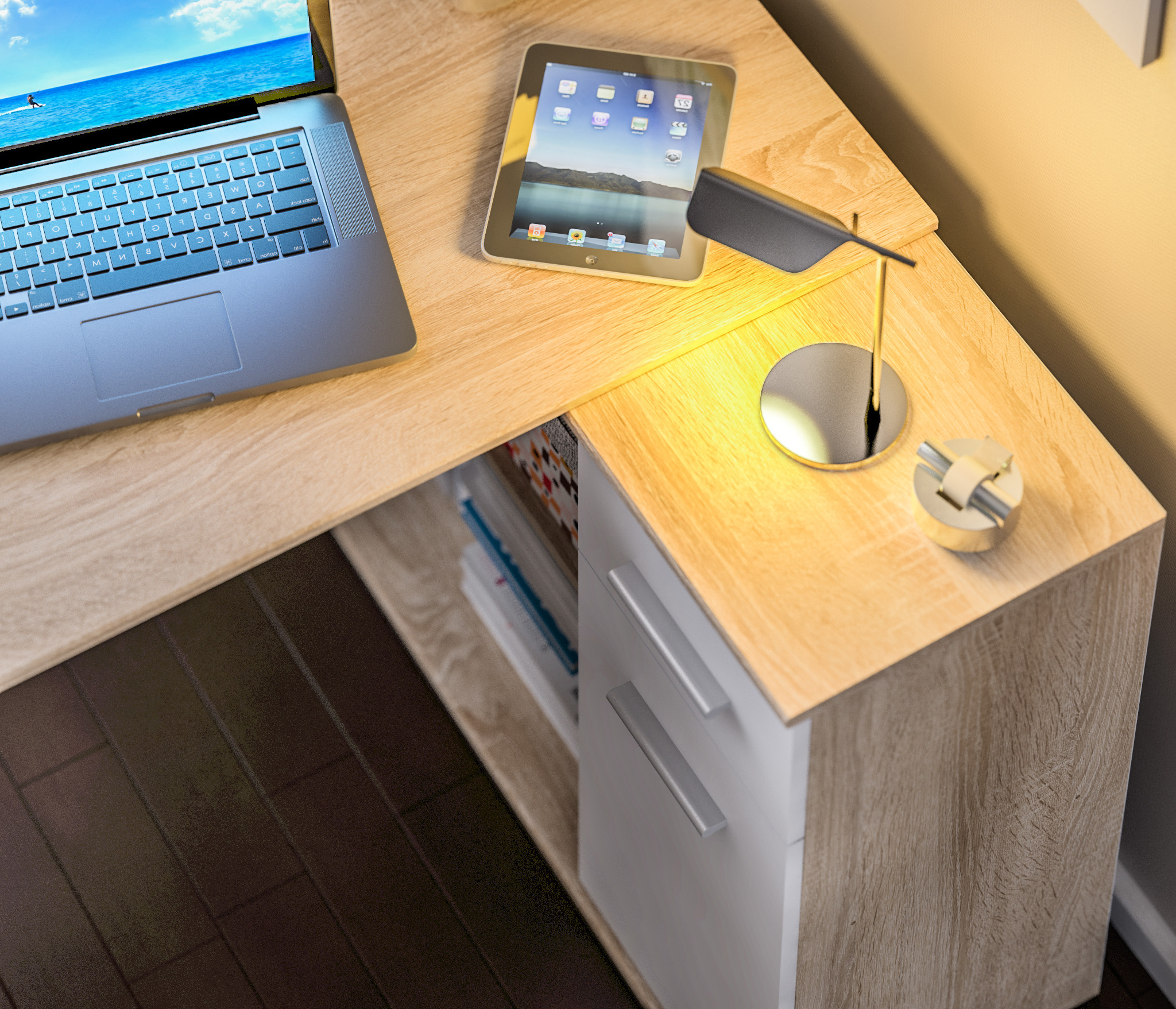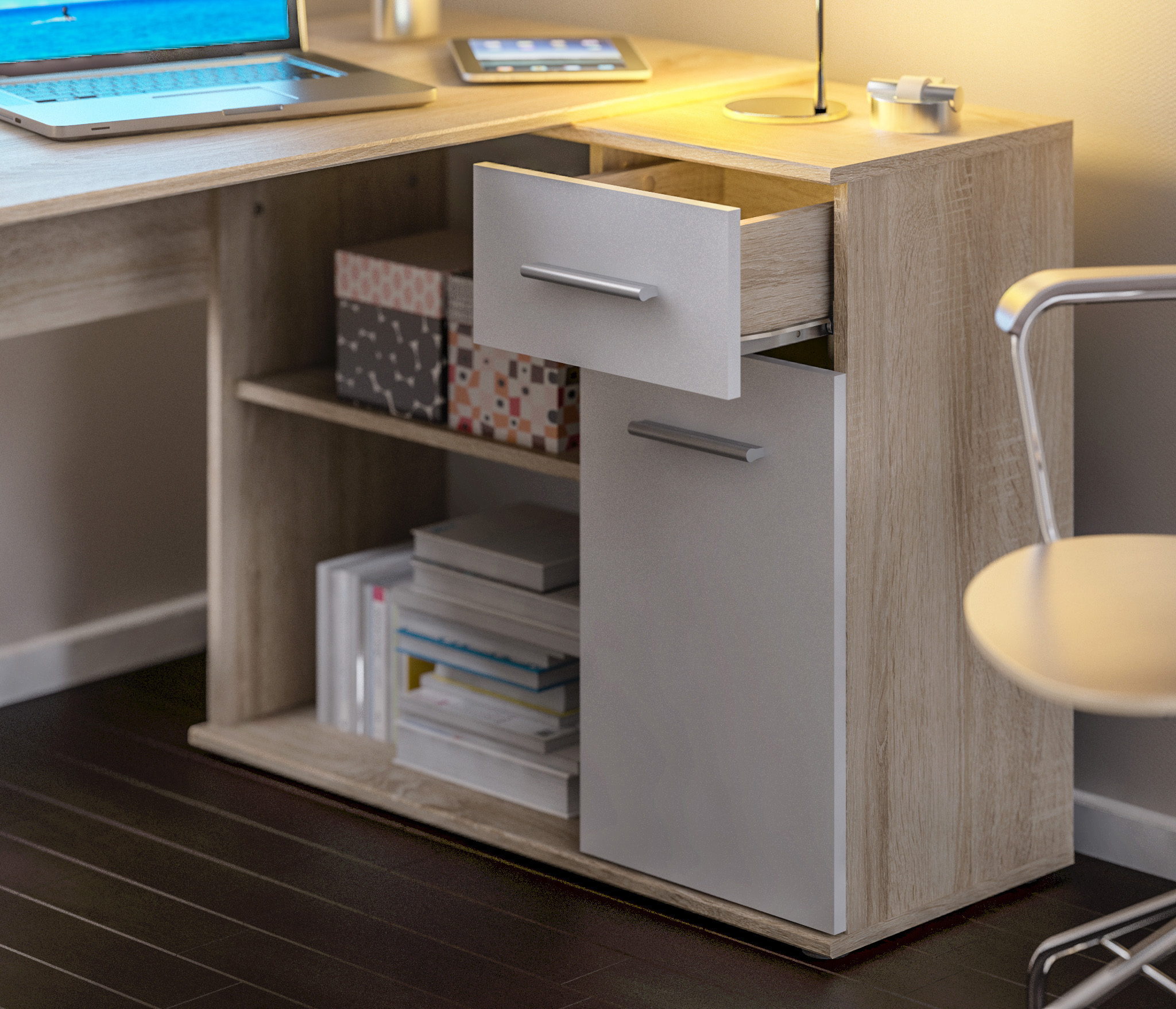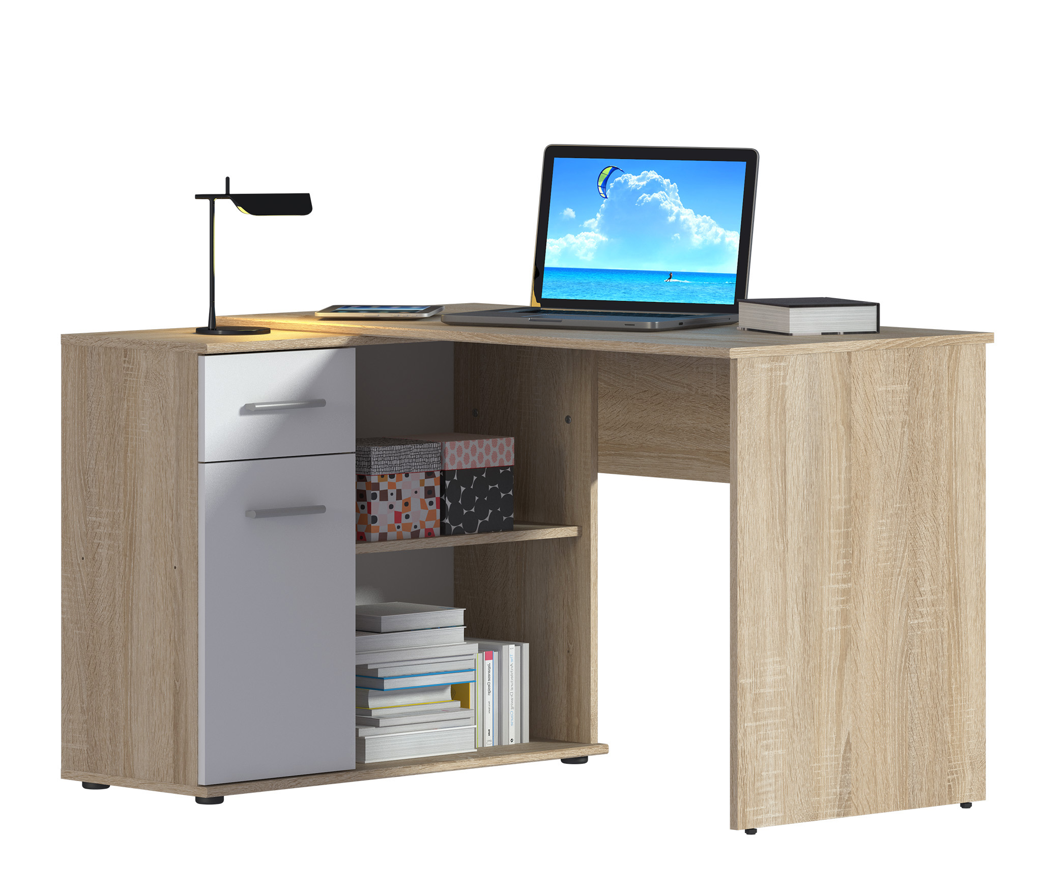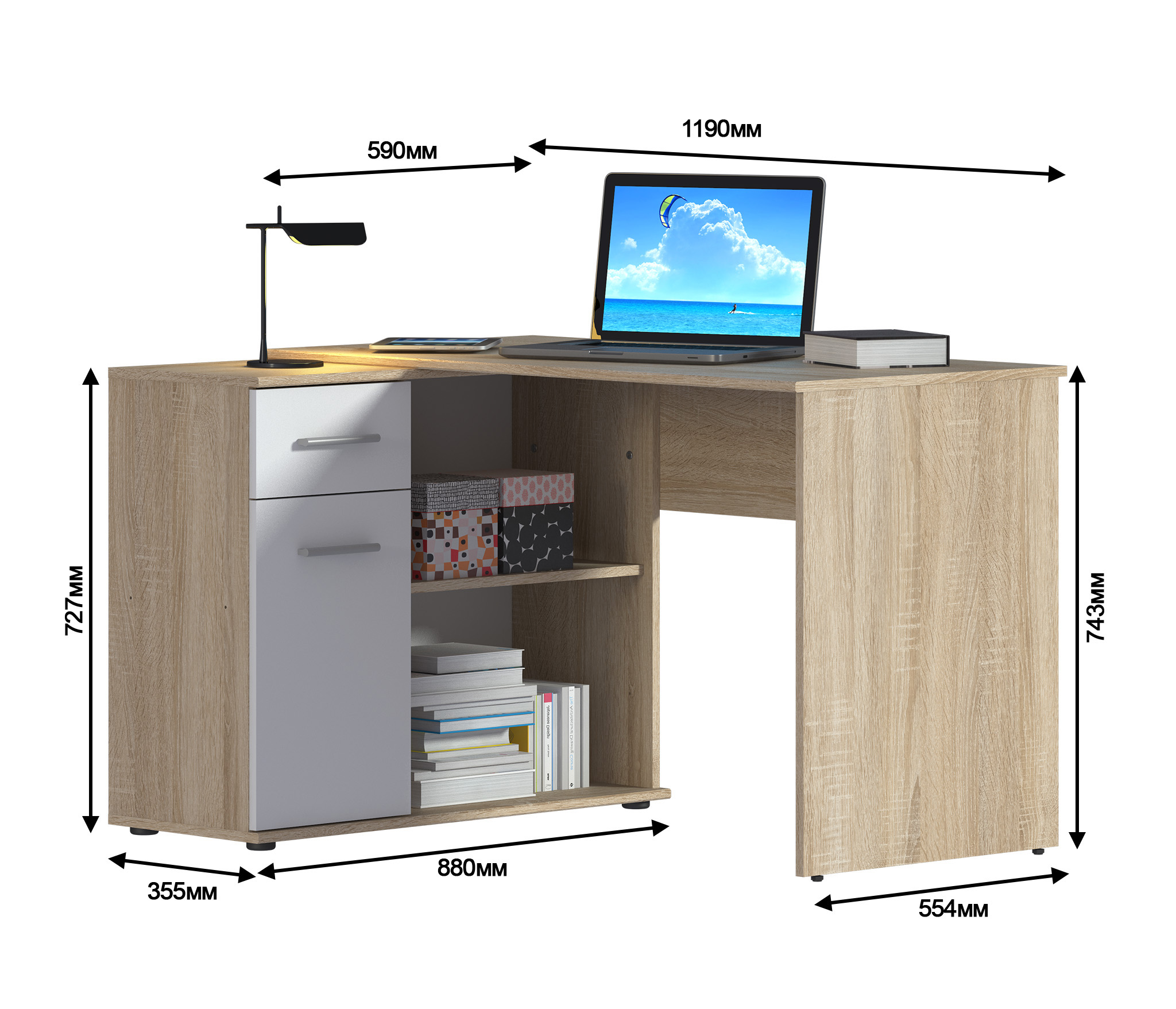 Стол-тумба Мамбо СБ-2886 – продуманное и комфортное рабочее место. Идеальный вариант, если есть необходимость в двух письменных столах. Простая конструкция, светлый оттенок, лаконичный угловой дизайн позволяют без проблем разместить стол-тумбу Мамбо в детской, комнате школьника или студента, а также в кабинете. Габаритные размеры – ширина 119 см, высота 74 см и глубина 91 см. Под рабочей поверхностью расположена тумба с открытыми вместительными полками, а также выдвижной ящик и закрытое отделение с отдельной дверцей. Стол произведен из современного экологичного КДСП. Корпус и рабочая поверхность выполнены в цвете «Дуб Сонома», фасадные поверхности в Белом цвете. Возможен как левый, так и правый вариант сборки.