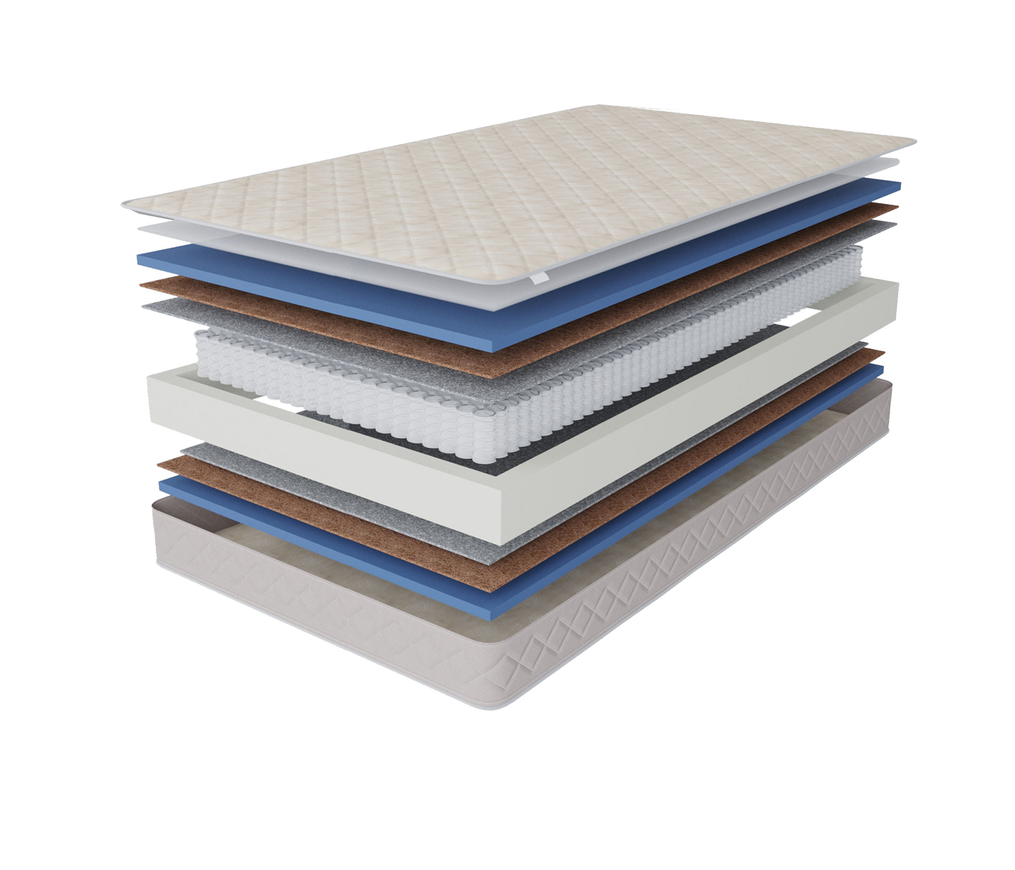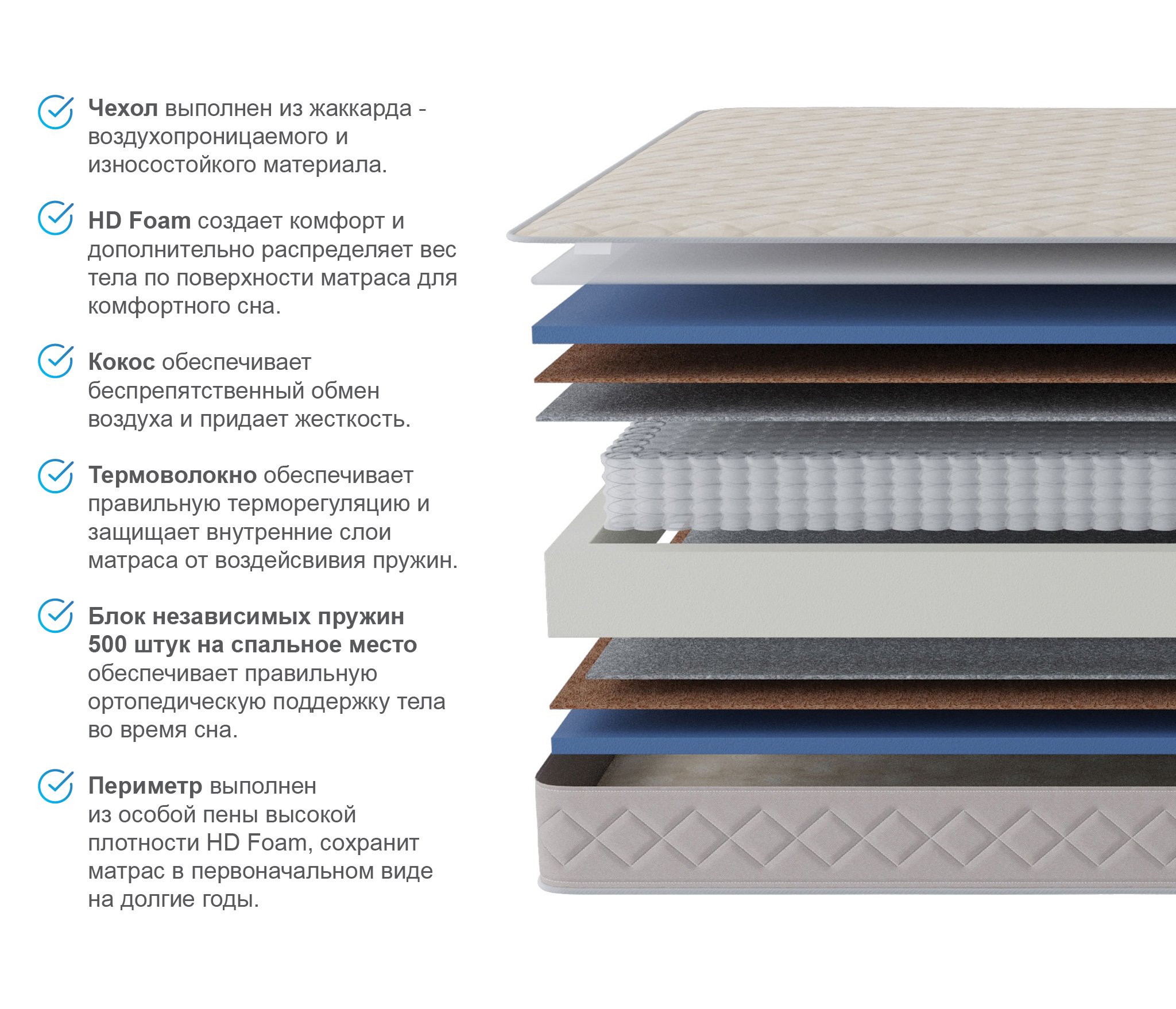 Это классическая конструкция матраса, универсальный блок пружин с точечной поддержкой, термоволокно, которое защитит комфортные слои от соприкосновения с пружинами и соответственно истерания. Слои кокоса добавят необходимой жесткости и прочности.