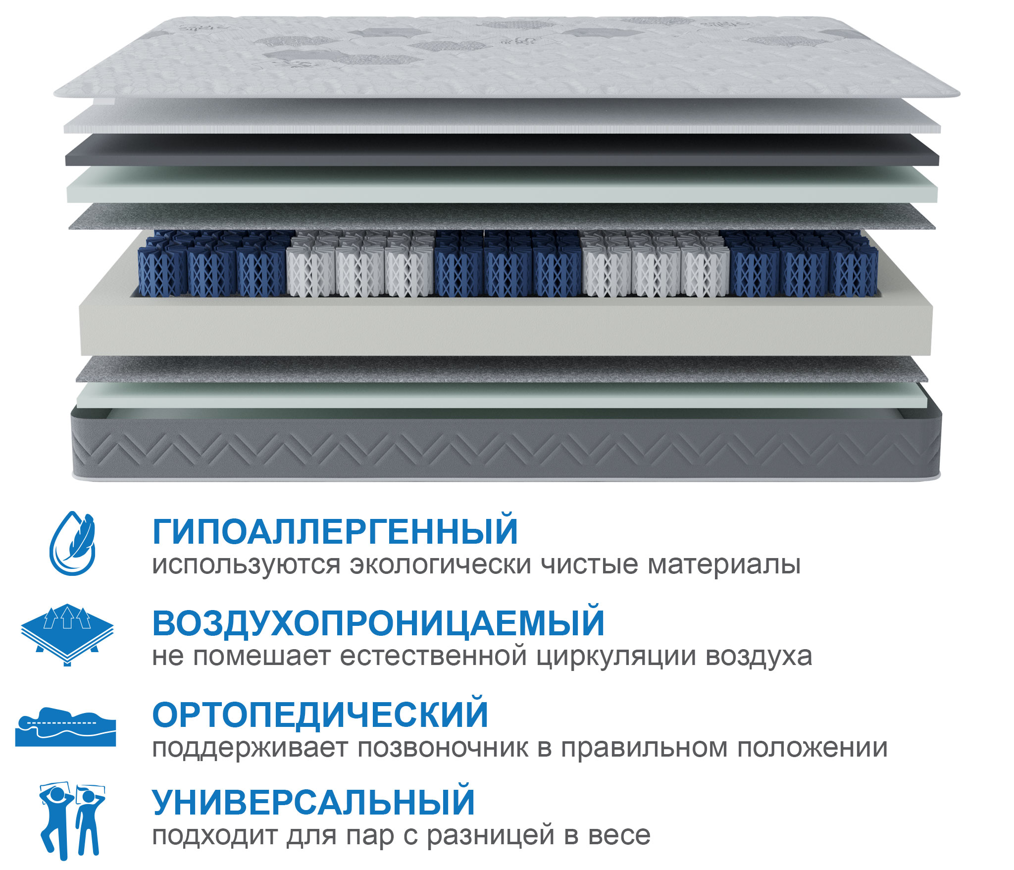 Все пены в составе матраса имеют сертификат CertiPur. CertiPur – независимая сертификация по европейскому стандарту, разработанному специально для пен, которые используются в изготовлении матрасов и мягкой мебели. Матрас прошел испытание в лаборатории качества, что гарантирует высочайшее качество, долговечность матраса и высокий уровень комфорта. Трикотажный дышащий чехол поддерживает исключительную вентиляцию матраса, позволяя вашему телу дышать всю ночь, и вы ощущаете себя как на облаке.