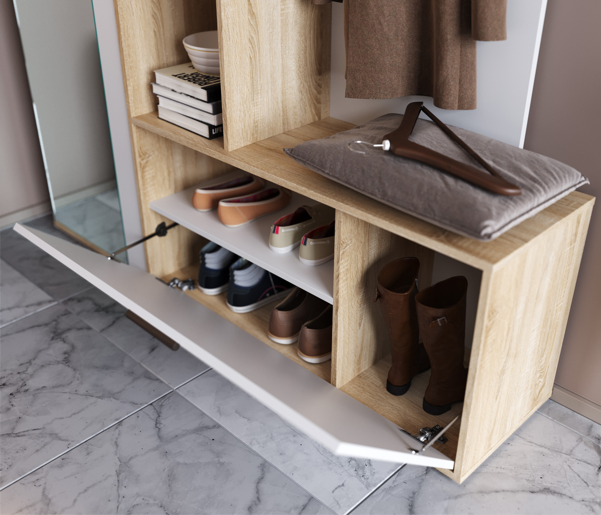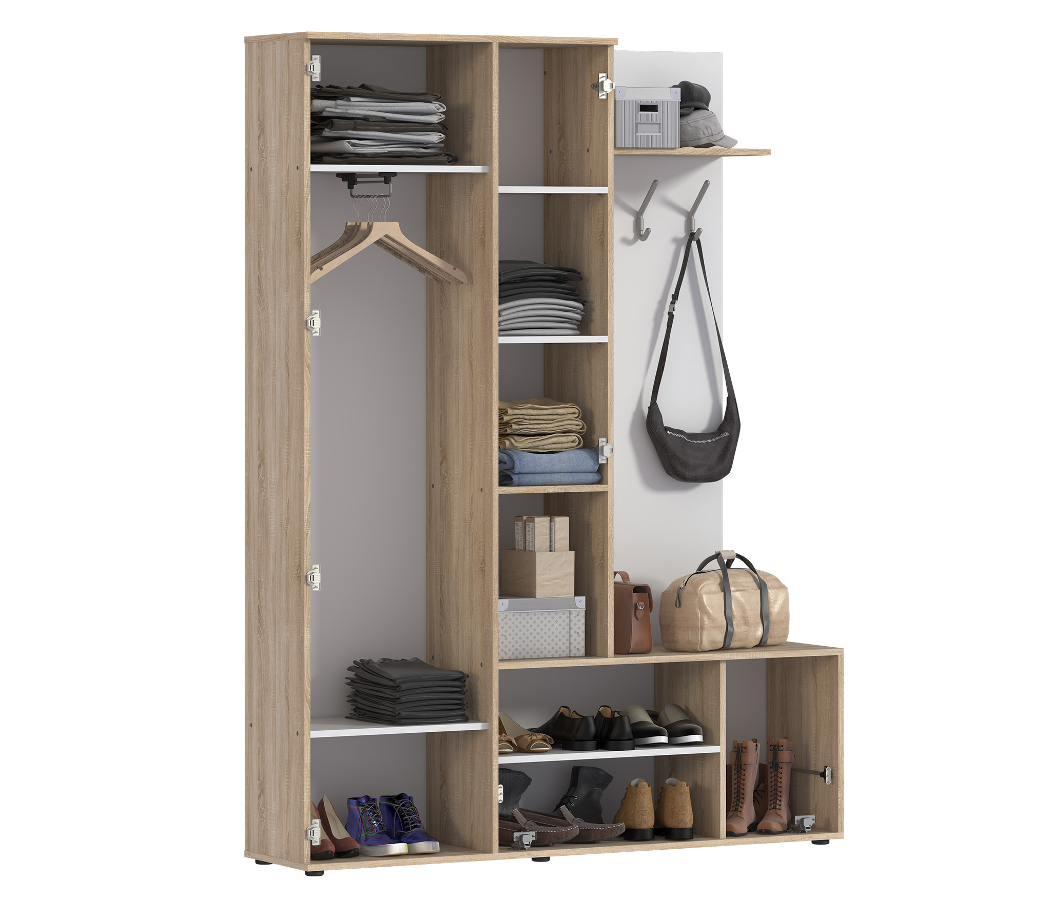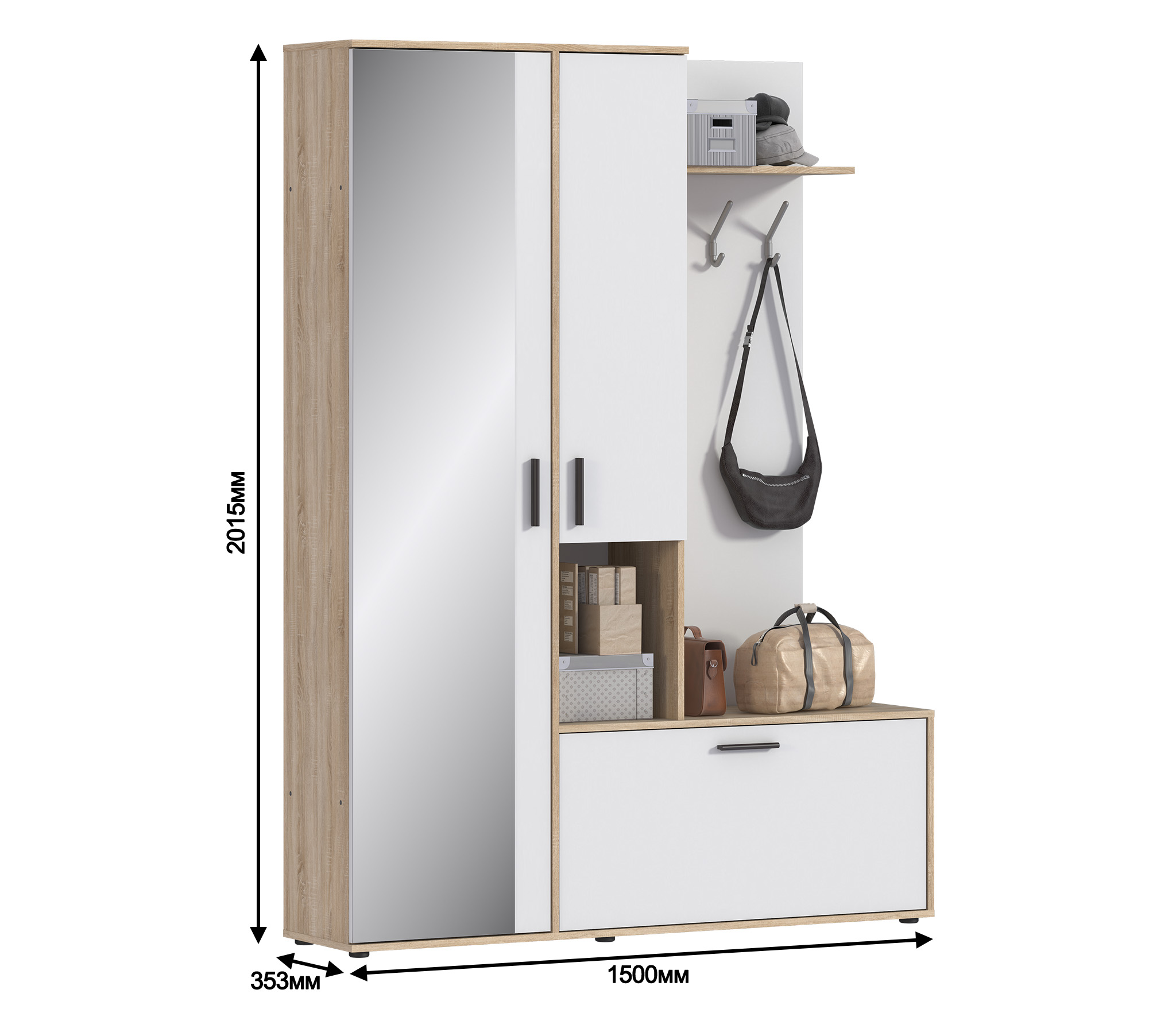 Прихожая «Саша» - компактная и функциональная мебель, которая будет вас встречать и провожать каждый день. Вместительный шкаф для одежды вмещает 10 вешалок, тумба под коробки и мелочь с 4-мя полками, обувной отдел для 18 пар обуви, и важная деталь - зеркало, которое позволяет разглядеть себя в полный рост. Материл фасадов и корпуса качественный ЛДСП.