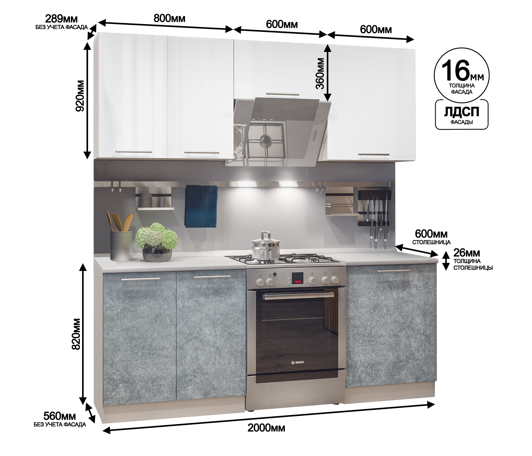 Обратите внимание: столешница, стеновая панель, аксессуары, бытовая техника, мойка и сушка для посуды в комплект не входят, их необходимо приобретать отдельно.