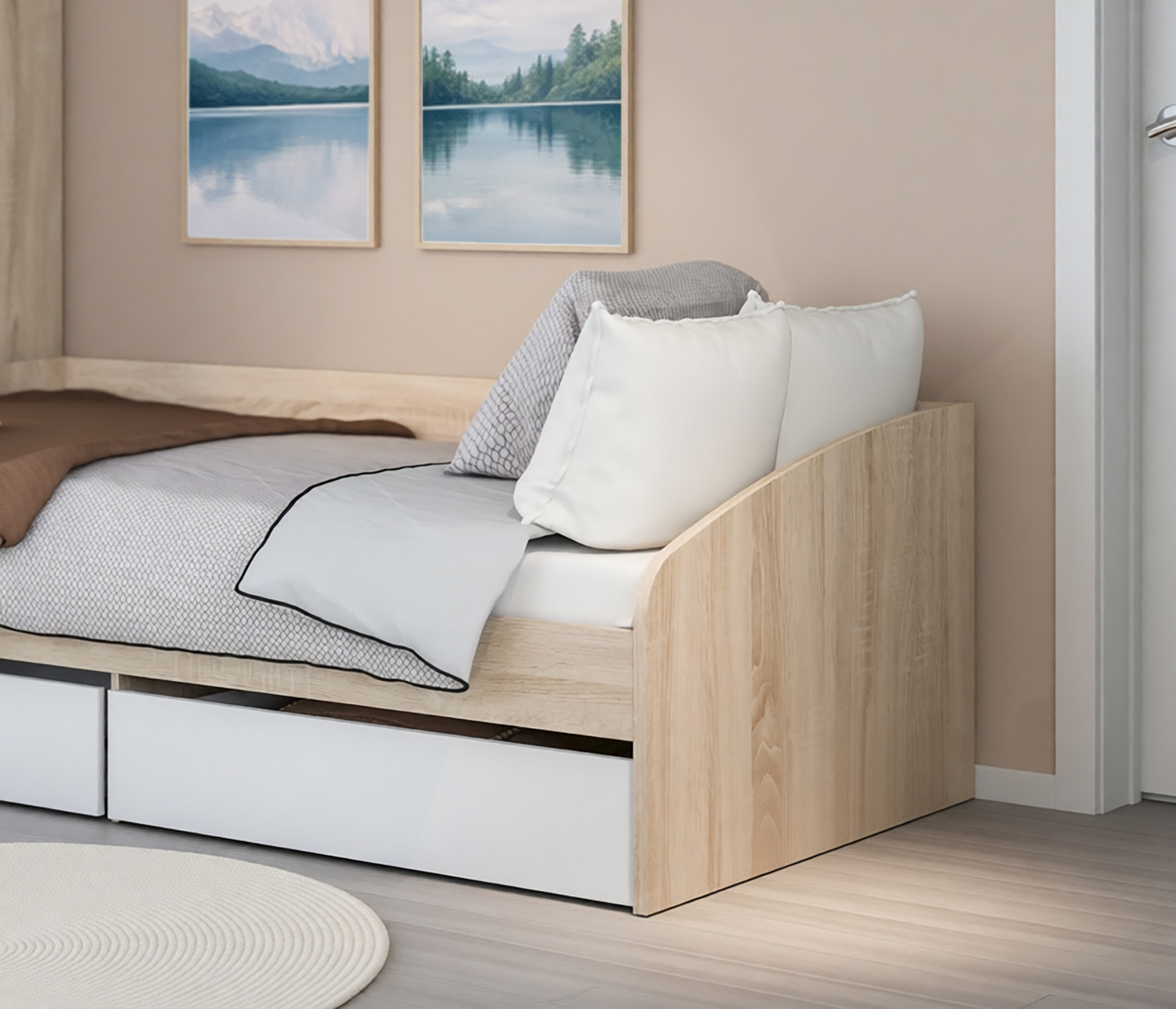 Хорошая сборка, материалы на ощупь приятные. Ящики под кроватью могли бы быть поглубже.