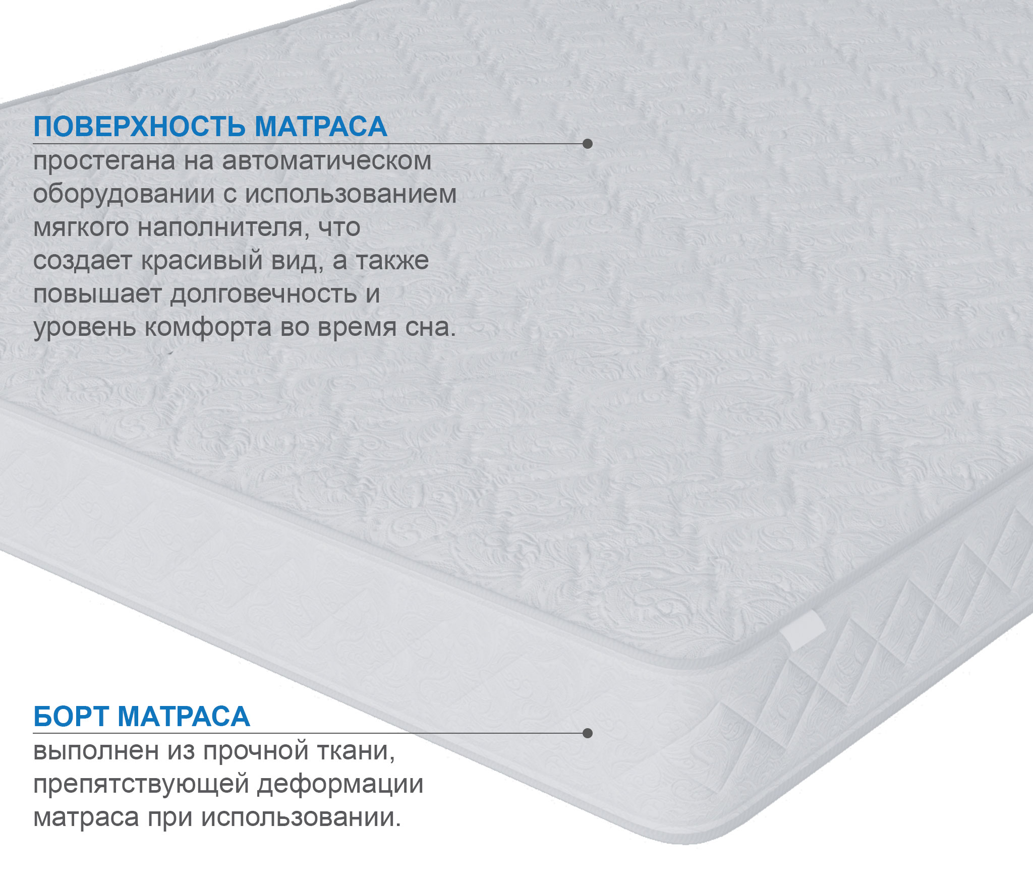 Первый и третий слои состоят из гипоаллергенной пены с прорезями ST Foam, которая создает комфорт и снимает напряжение со спины во время сна. Основа матраса - пена повышенной прочности HD Foam, принимает на себя основную нагрузку.