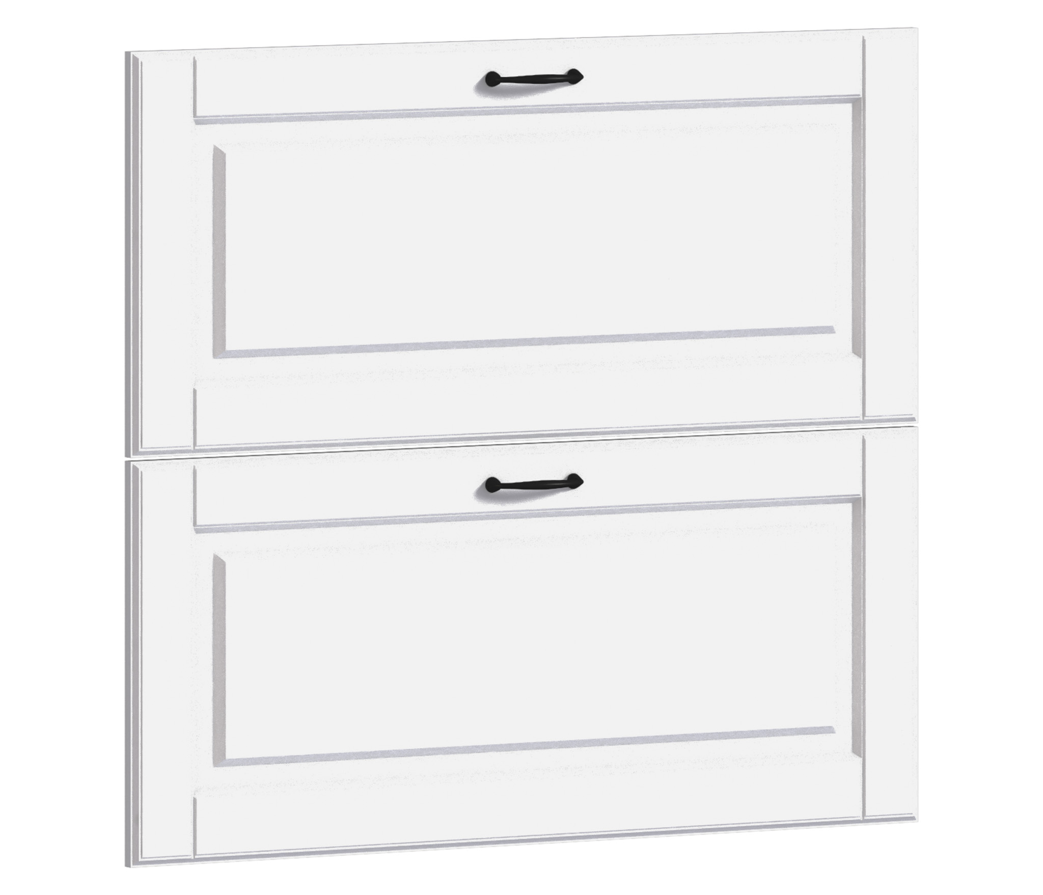 Две панели для ящиков шкафа. Они изготовлены из прочной и экологически чистой прессованной древесины. Панели устойчивы к воздействию воды и пара. Каждая панель дополнена двумя ручками в классическом стиле.