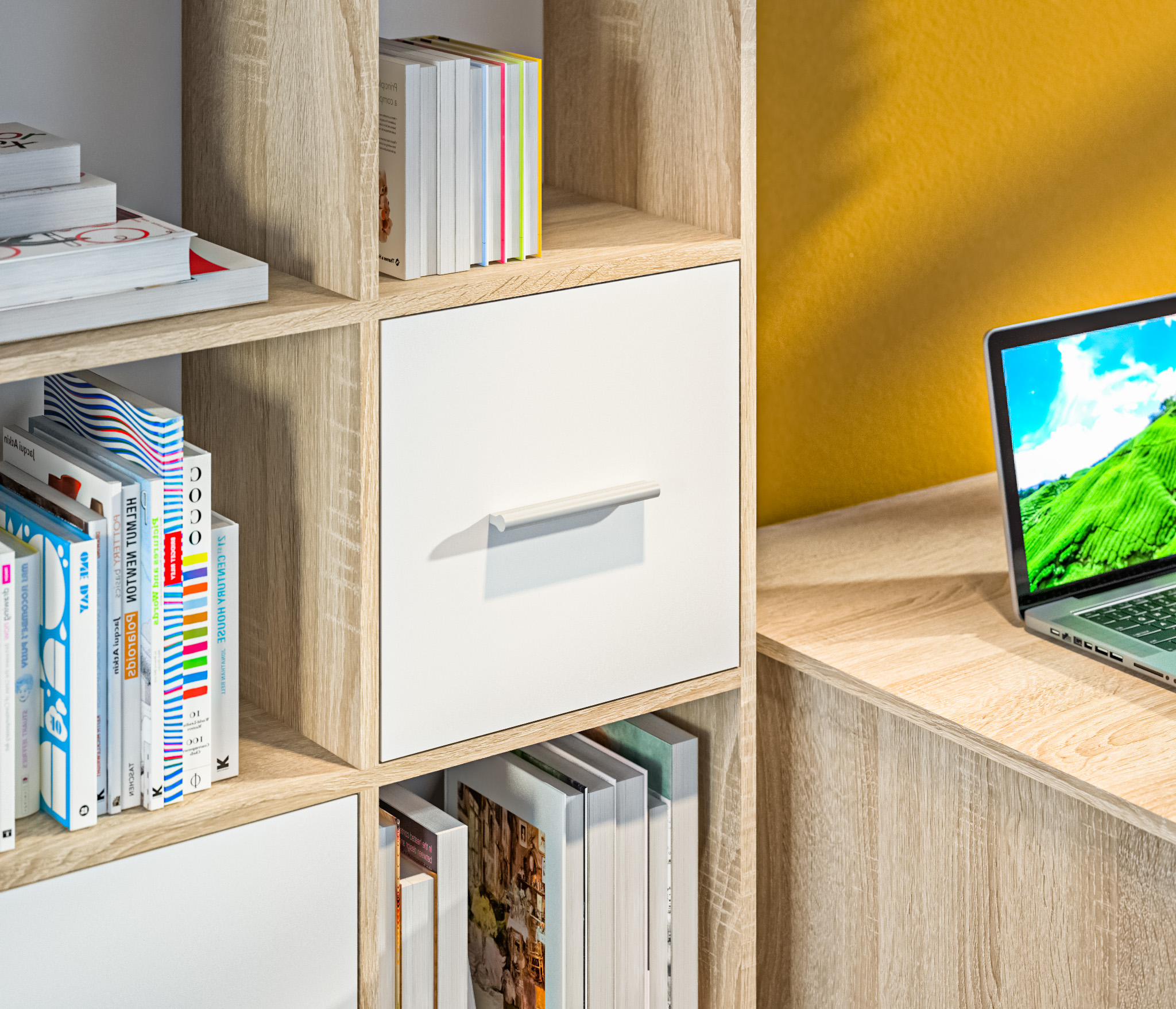 Модель производится из современного материала КДСП. Отделка комбинированная – корпус в цвете «Дуб Сонома», фасадные поверхности белые.