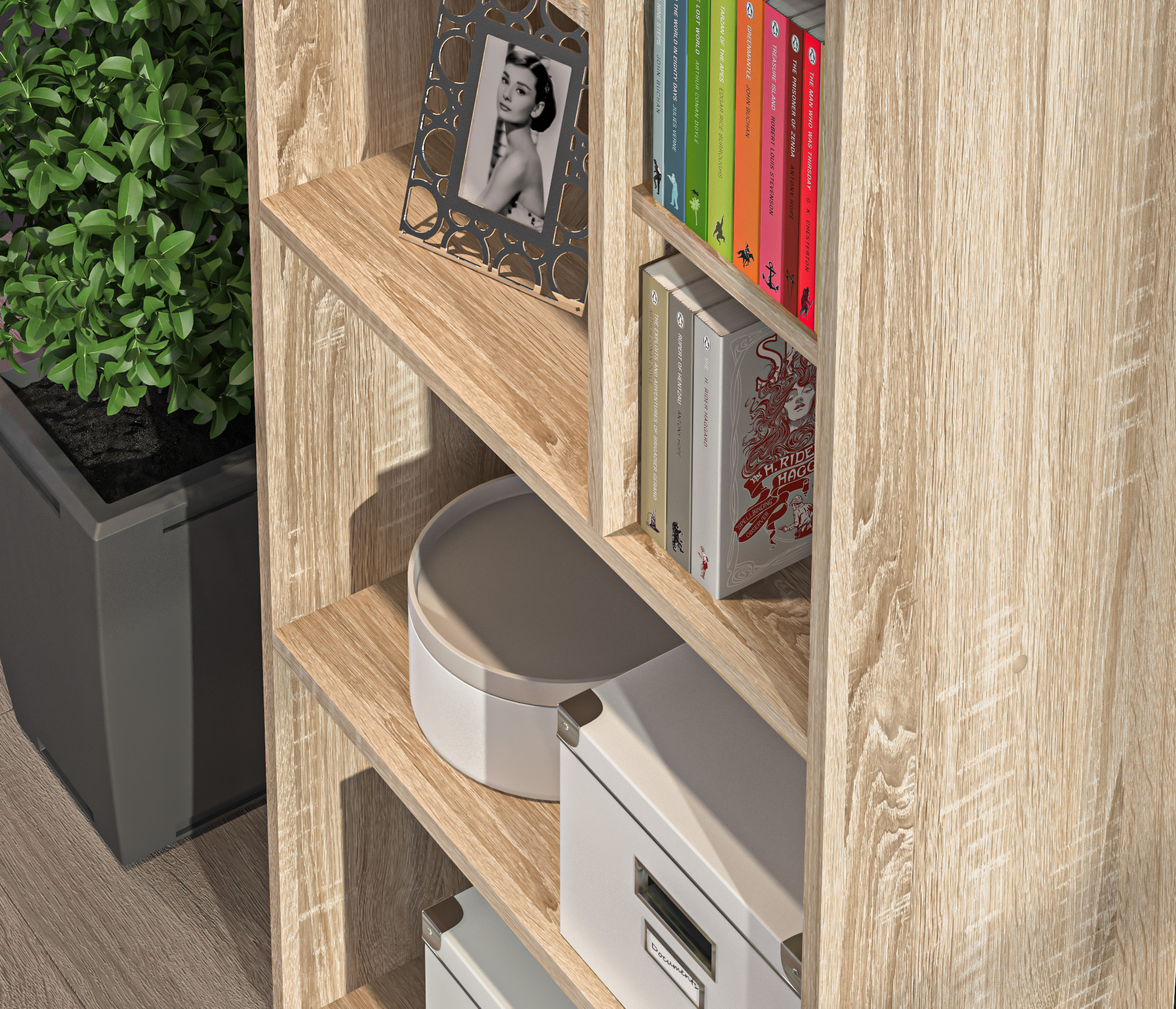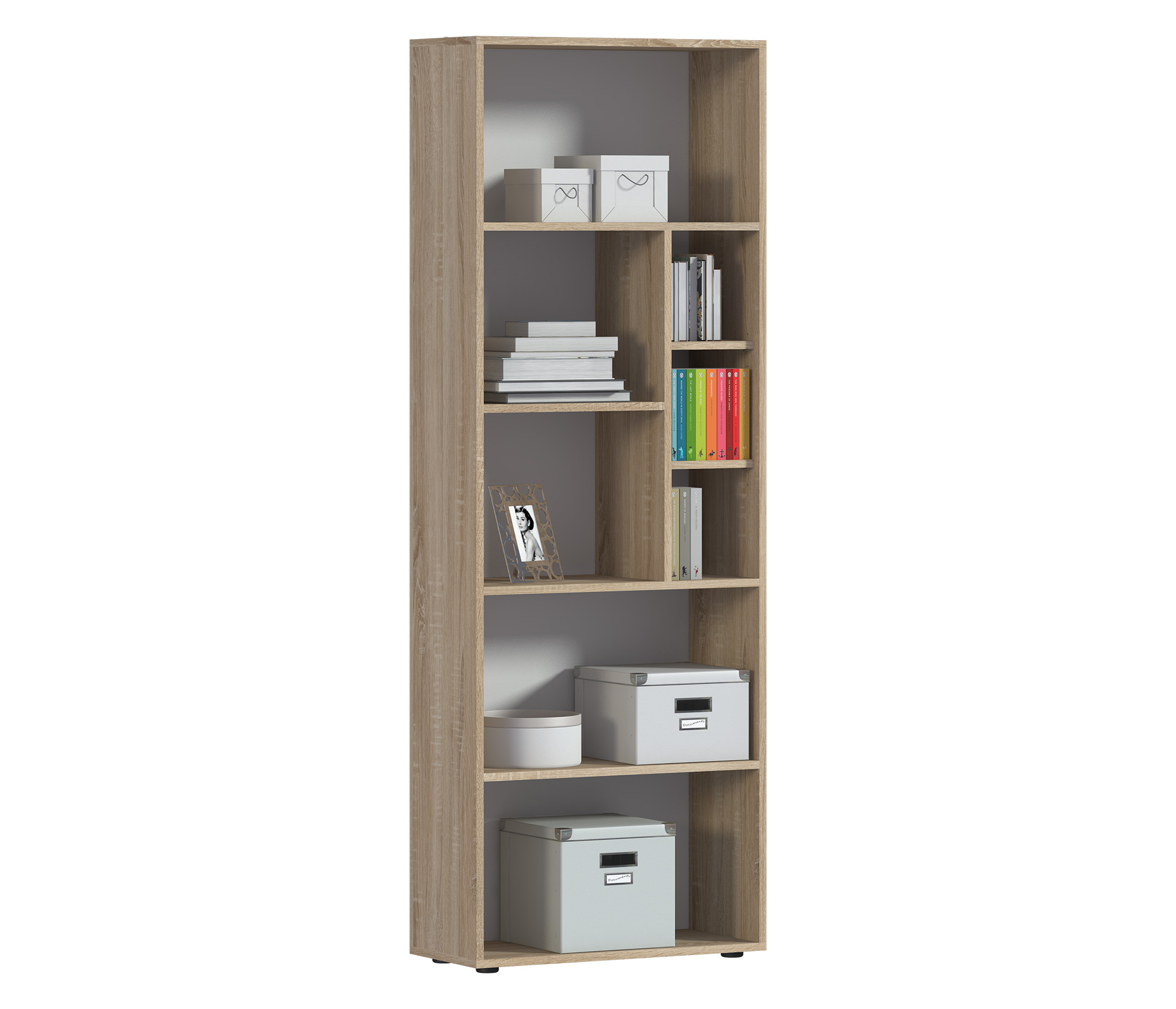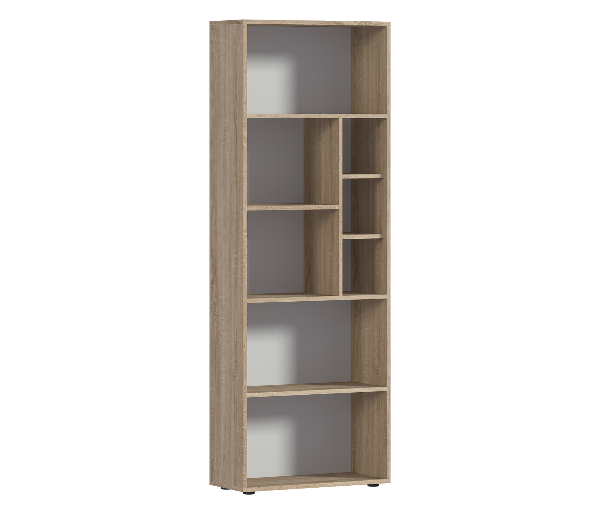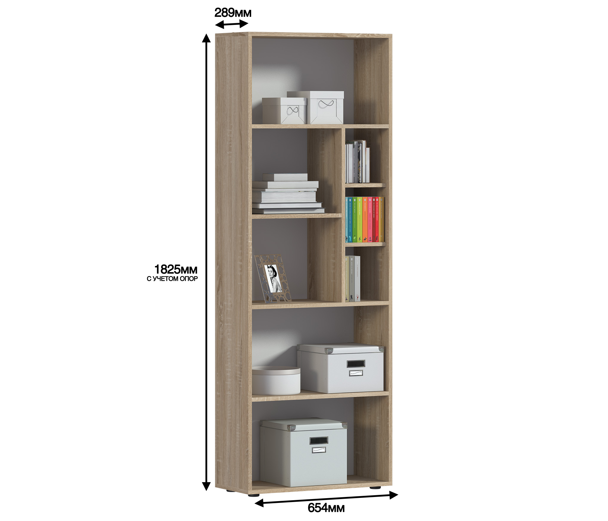 Габаритные размеры – ширина 65 см, высота 182 см и глубина 28 см. Конструкция стеллажа представляет собой ряд открытых полок на пяти уровнях. Две нижних и верхняя полки одинакового размера. Две средних полки поделены на секции.