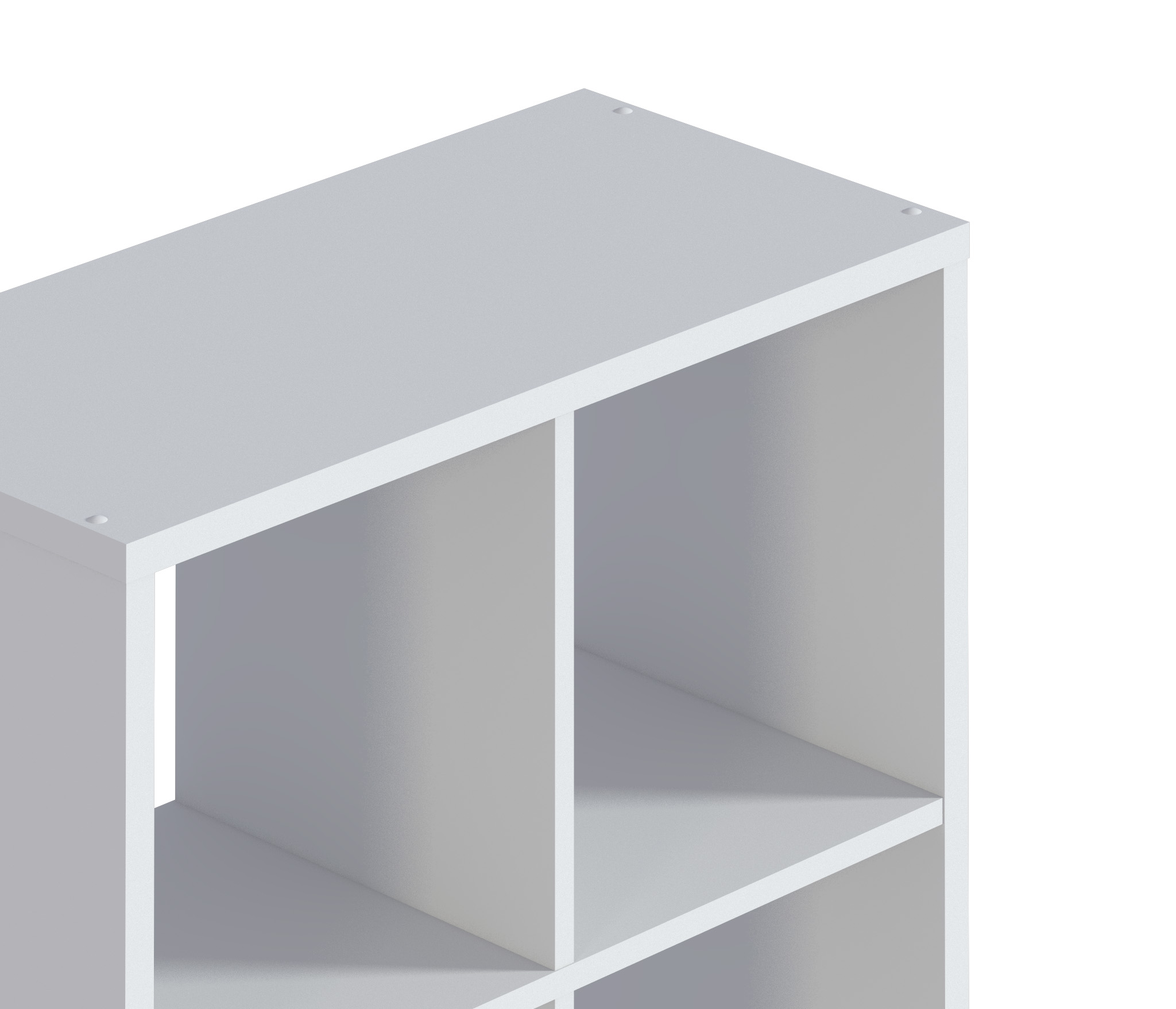 Габаритные размеры – ширина 71 см, высота 71 см и глубина 34 см. Конструктивно стеллаж представляет собой четыре отделения. Выполнен стеллаж из современного и прочного КДСП в белом цвете. Стеллаж идеально подойдет для оформления кабинета, гостиной, детской, спальни и даже прихожей в современном стиле.
