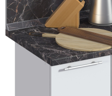 Основа – влагостойкое ДСП, толщиной 38 мм. Пластик толщиной 04-0,5 мм. Задний срез обработан меламиновой кромкой. Низ закрыт защитным покрытием бэкинг, которое защищает ДСП от влаги. Столешница оснащена уникальным каплесборником (специальная силиконовая накладка, монтируемая в паз на передней части столешницы снизу). Препятствует стеканию капель воды со столешницы на фасады и встроенную техник, расположен под углом 12,7 гр. Произведена на полностью автоматизированном немецком оборудовании. Поставляется в упаковке.