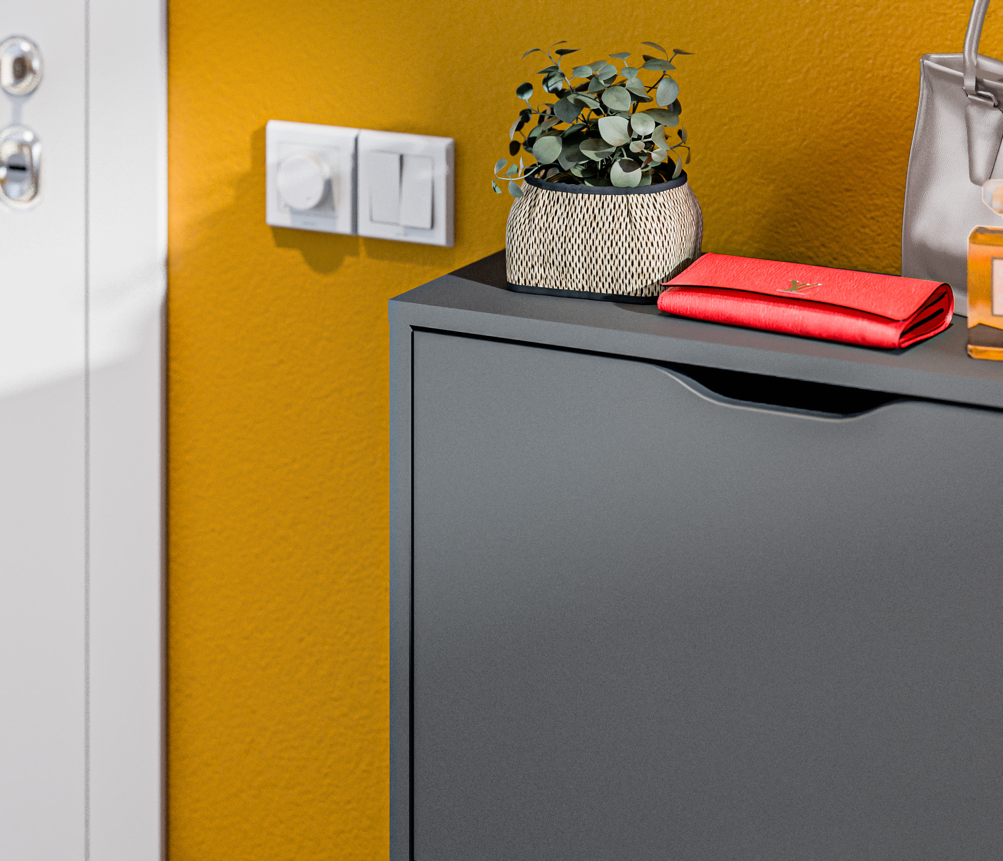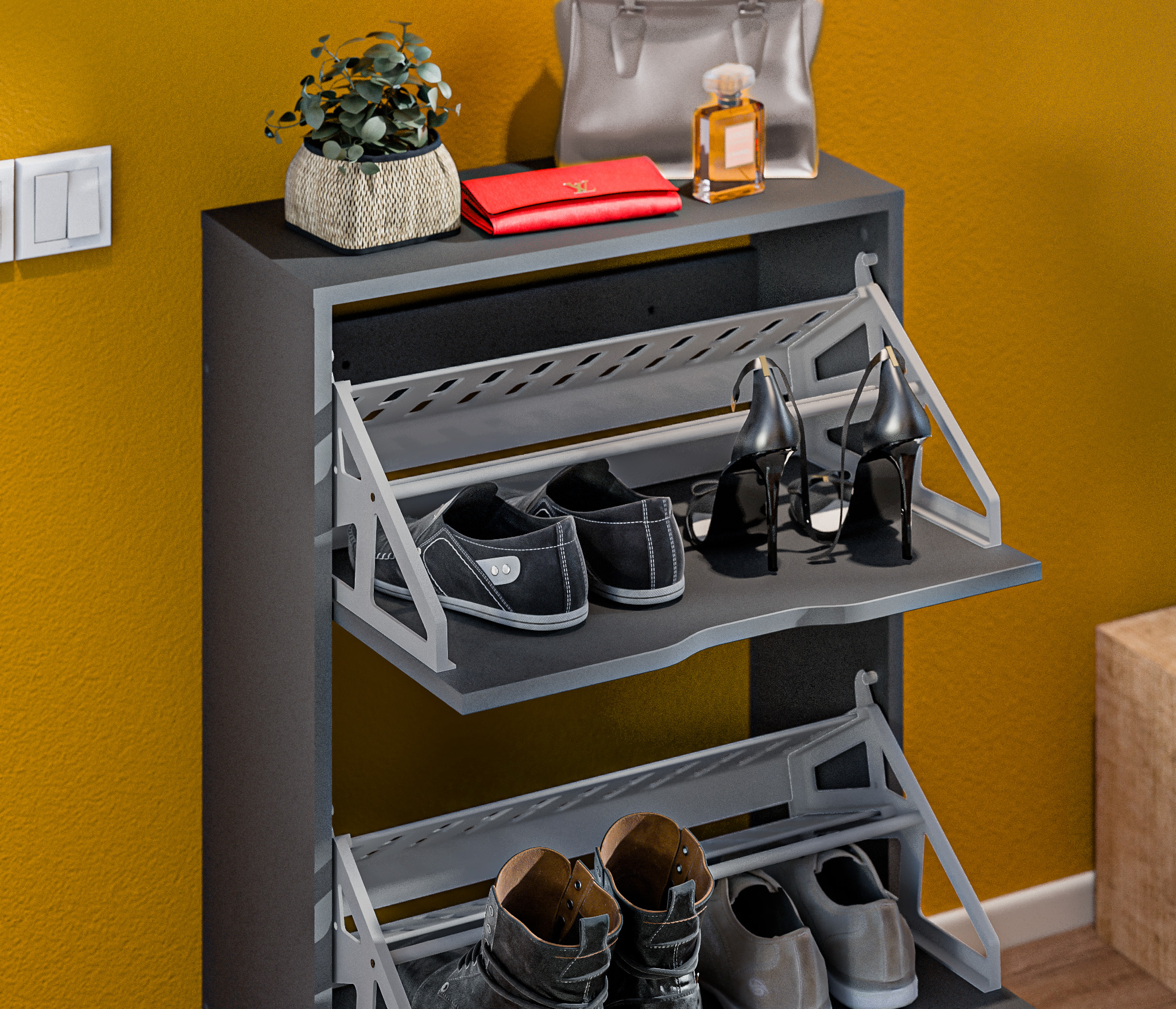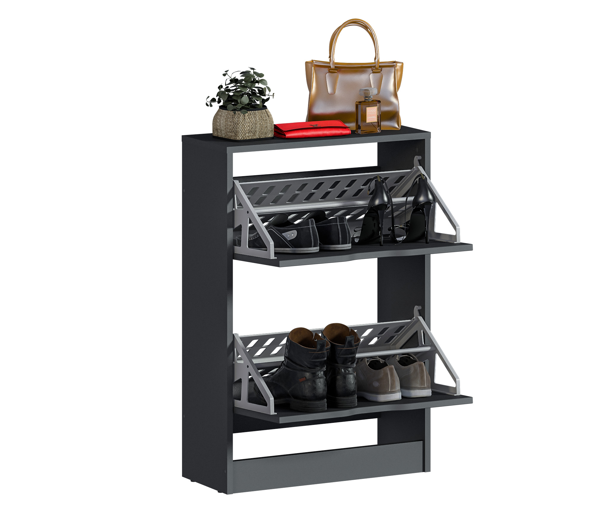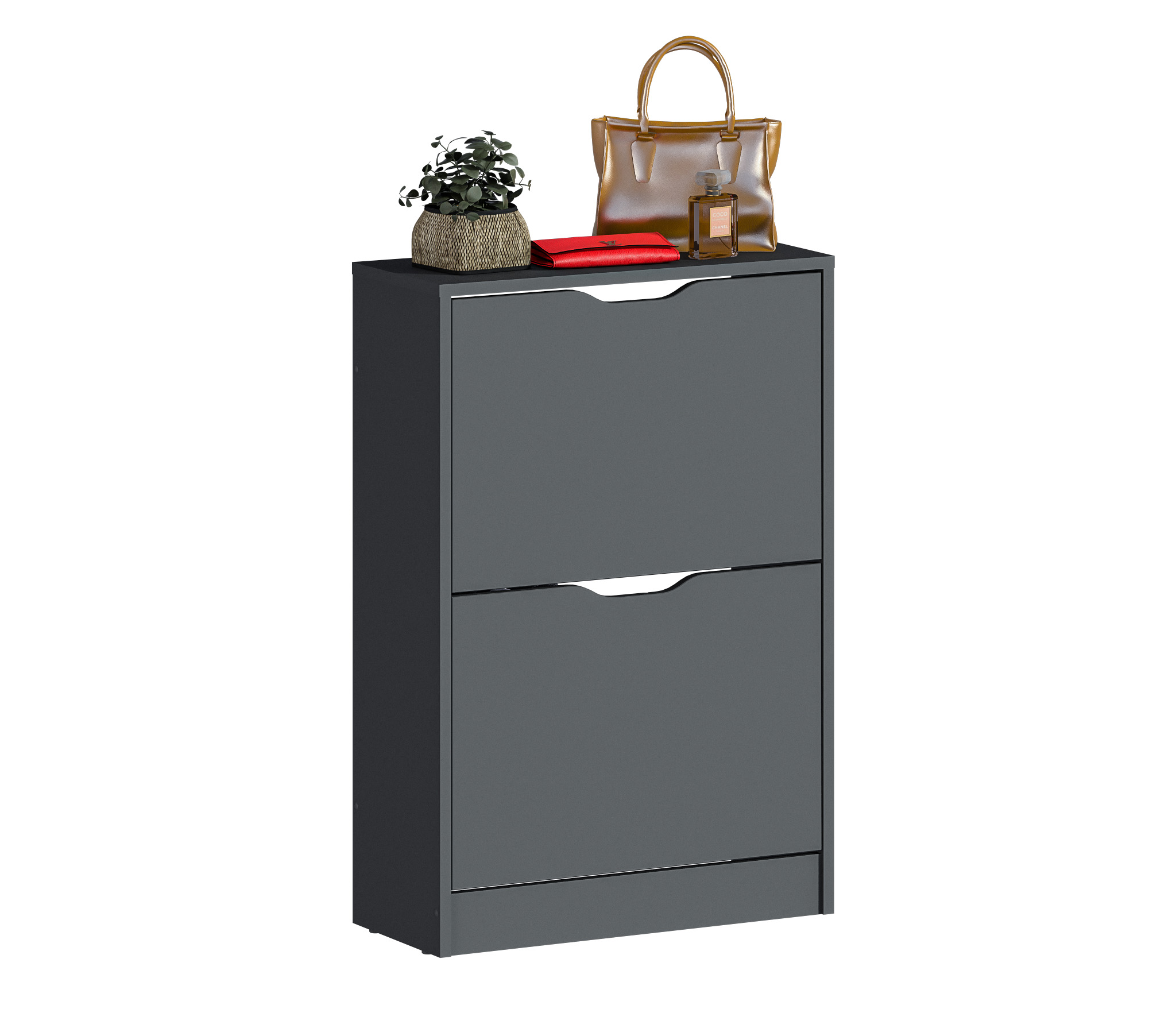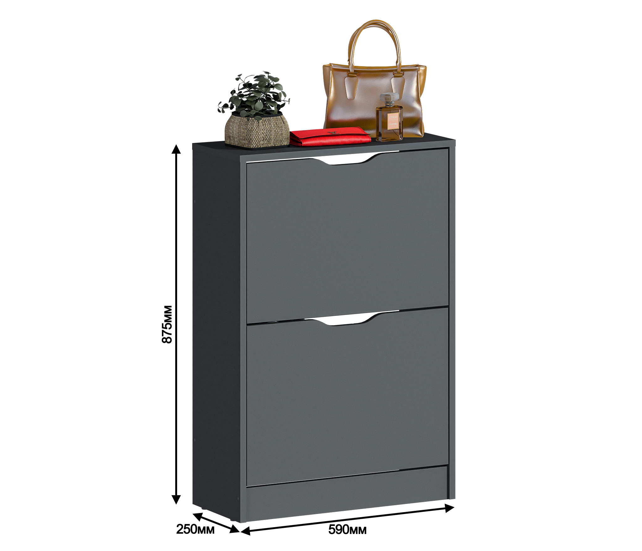 Габаритные размеры – ширина 59 см, высота 87 см и глубина 25 см. Обувница имеет два отделения, каждое из которых оснащено специальными стойками для хранения обуви. Прорезные ручки и строгие геометрические формы позволяют вписать обувницу в любой интерьер. Обувница произведена из экологичного прочного КДСП, устойчивого к мелким механическим повреждениям.