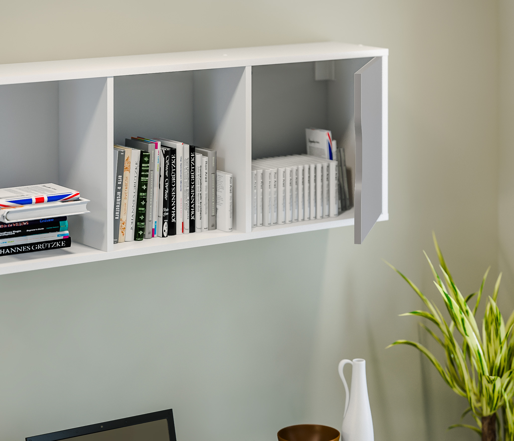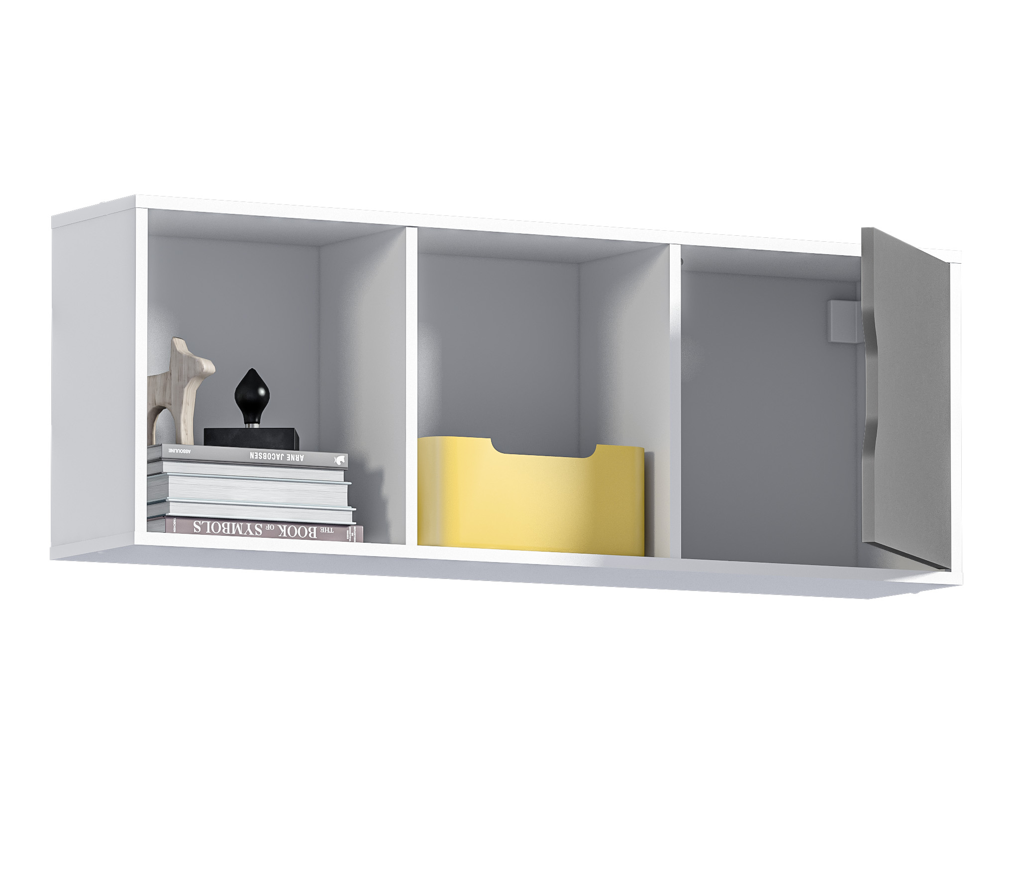 Полка Mika / Мика СБ-3279 – компактное место хранения книг, журналов, канцелярских принадлежностей или аудио, видео гарнитуры. Это навесная полка, которая является элементом модульной коллекции Мика и будет идеальным дополнением к столу из этой коллекции. Габаритные размеры – ширина 119 см, высота 35 см и глубина 24 см. Полка имеет три секции – две открытых и одну с дверцей. Материал корпуса – ЛДСП с отделкой в цвете «Белый Альпийский». Фасадная поверхность также из ЛДСП с отделкой в цвете «Серый перламутровый». Полка крепится к стене при помощи дюбелей, которые входят в комплект.