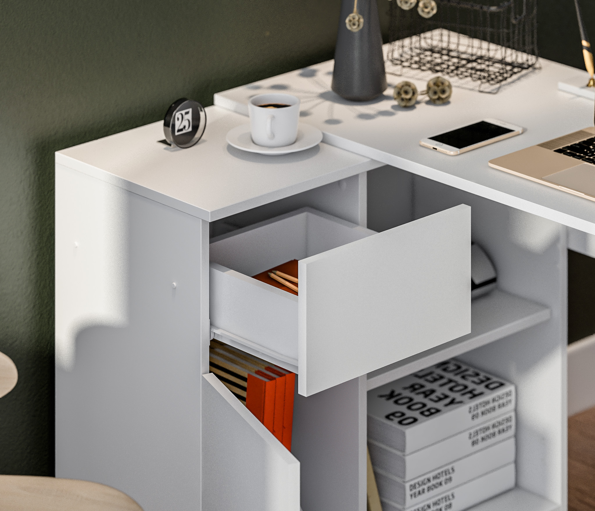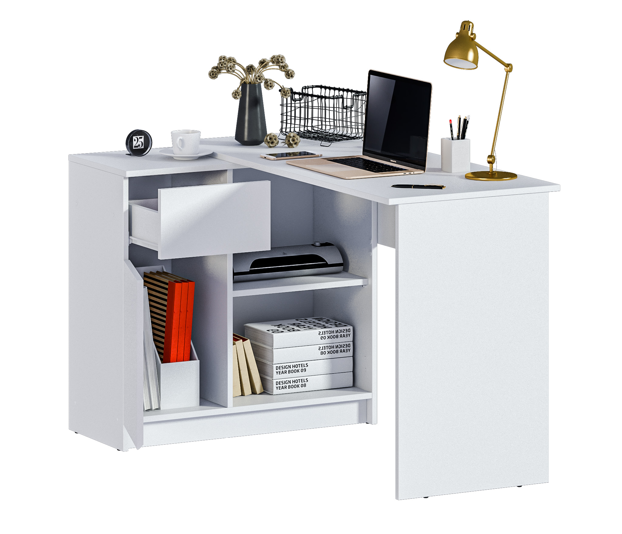 Габаритные размеры – ширина 119 см, высота 75 см и глубина 80 см. Под рабочей поверхностью расположена тумба с открытыми вместительными полками, а также выдвижной ящик и закрытое отделение с отдельной дверцей. Стол произведен из современного экологичного ЛДСП. Возможен как левый, так и правый вариант сборки.