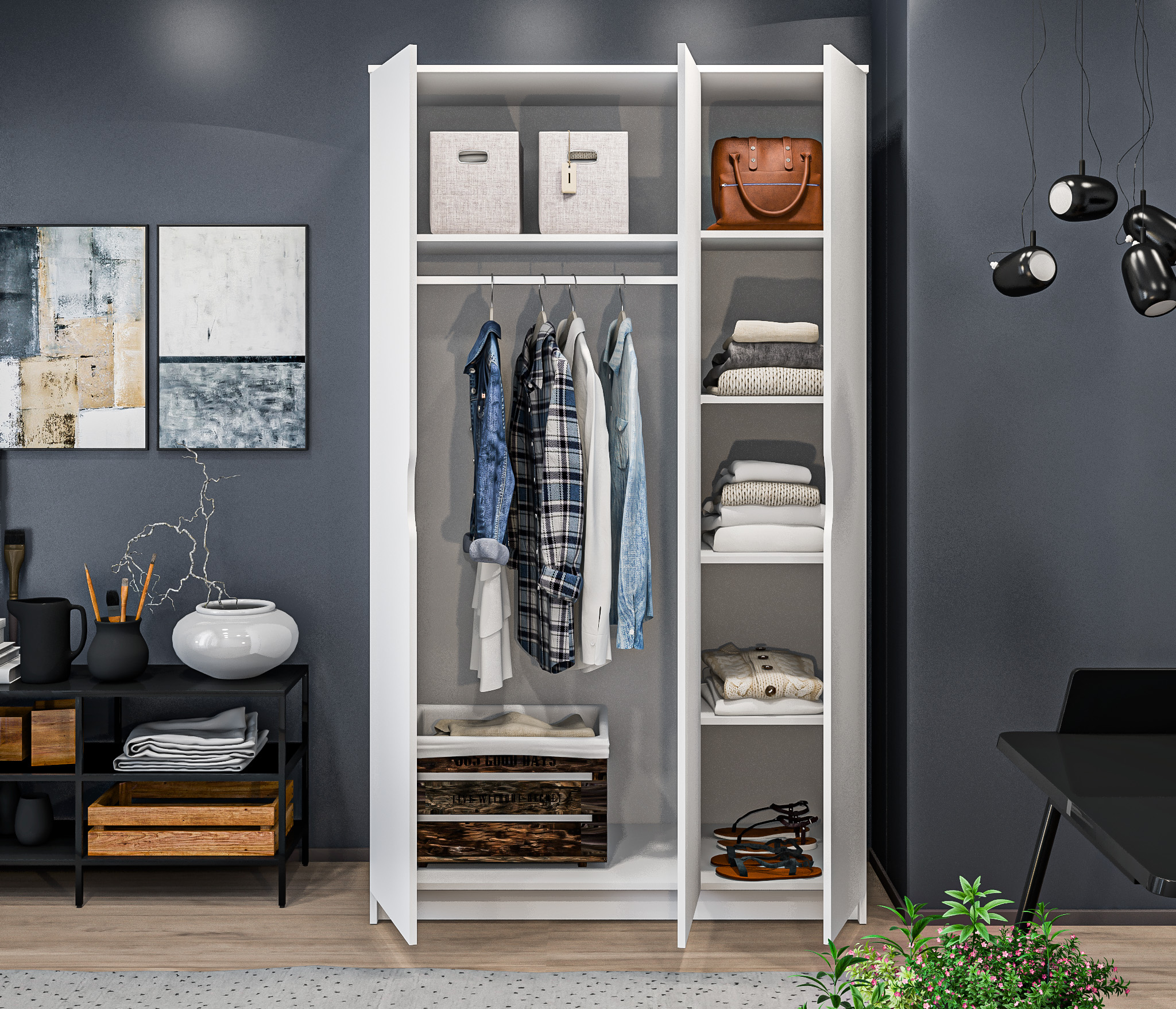 Шкаф имеет четыре полки и штангу для удобного хранения различных типов одежды. Шкаф не имеет ручек и обладает современным и минималистичным дизайном, который легко сочетается с различными интерьерами.