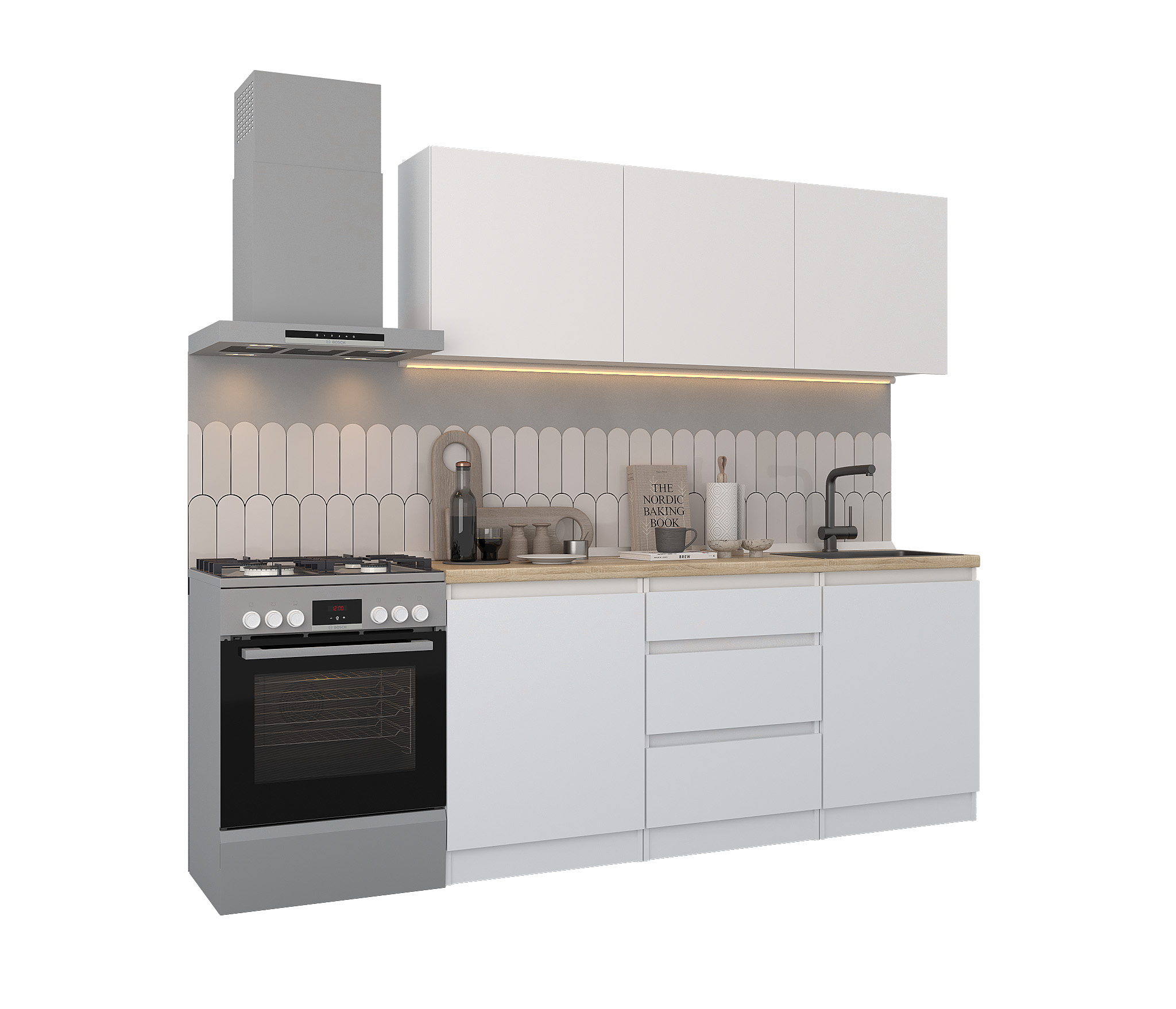 Кухня Леон состоит из нескольких модулей, включая шкаф-стол с ящиками под столовые приборы, обеспечивающий практичное и организованное хранение столовых приборов, посуды и других кухонных аксессуаров.