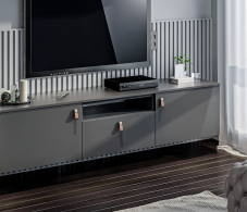 Выбор ручек является дополнительной опцией. В данной гостиной представлена ручка-кнопка в цвете хром/капучино для тумбы под телевизор и пенала, а верхняя полка оснащена механизмом Push To Open, который позволяет открывать ее легким нажатием.