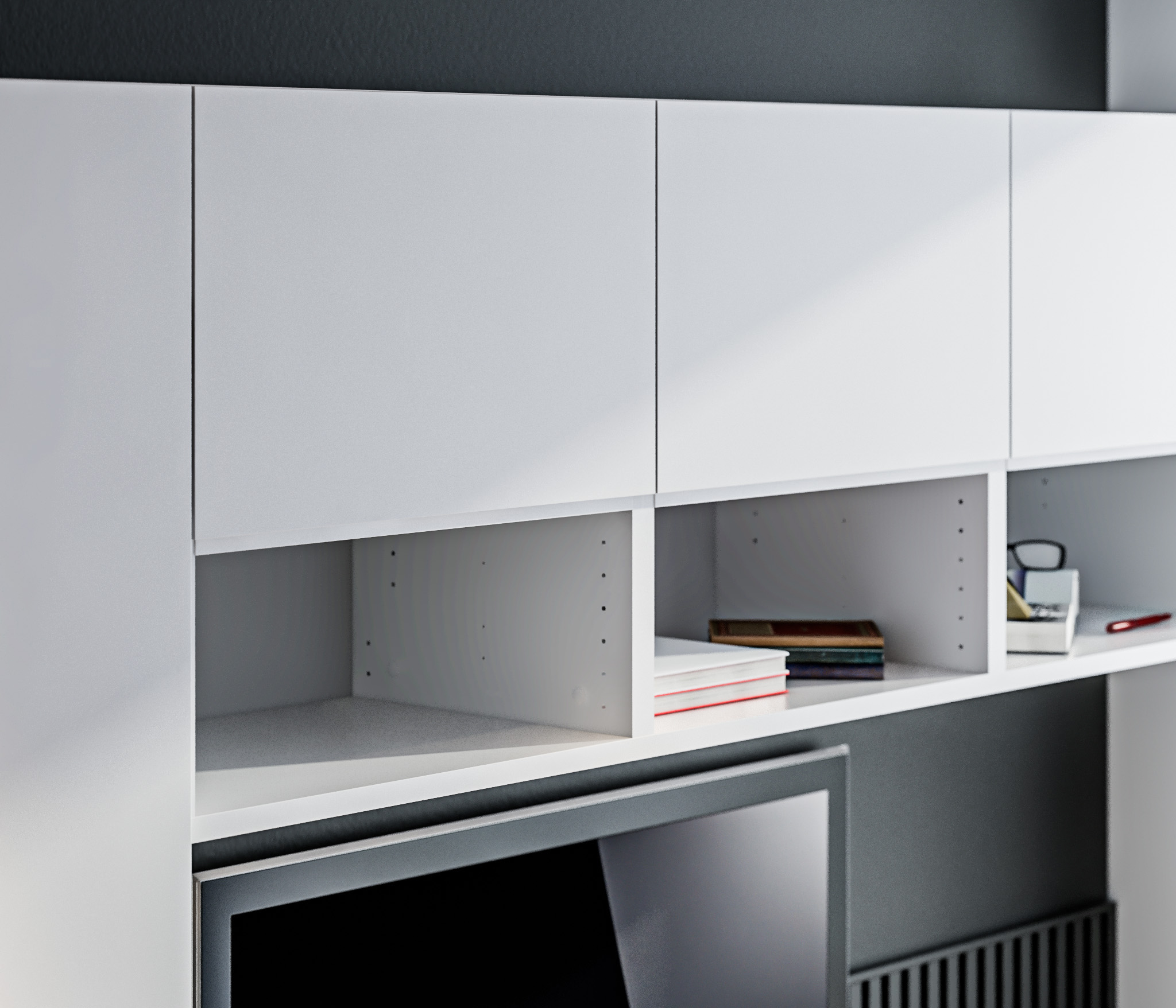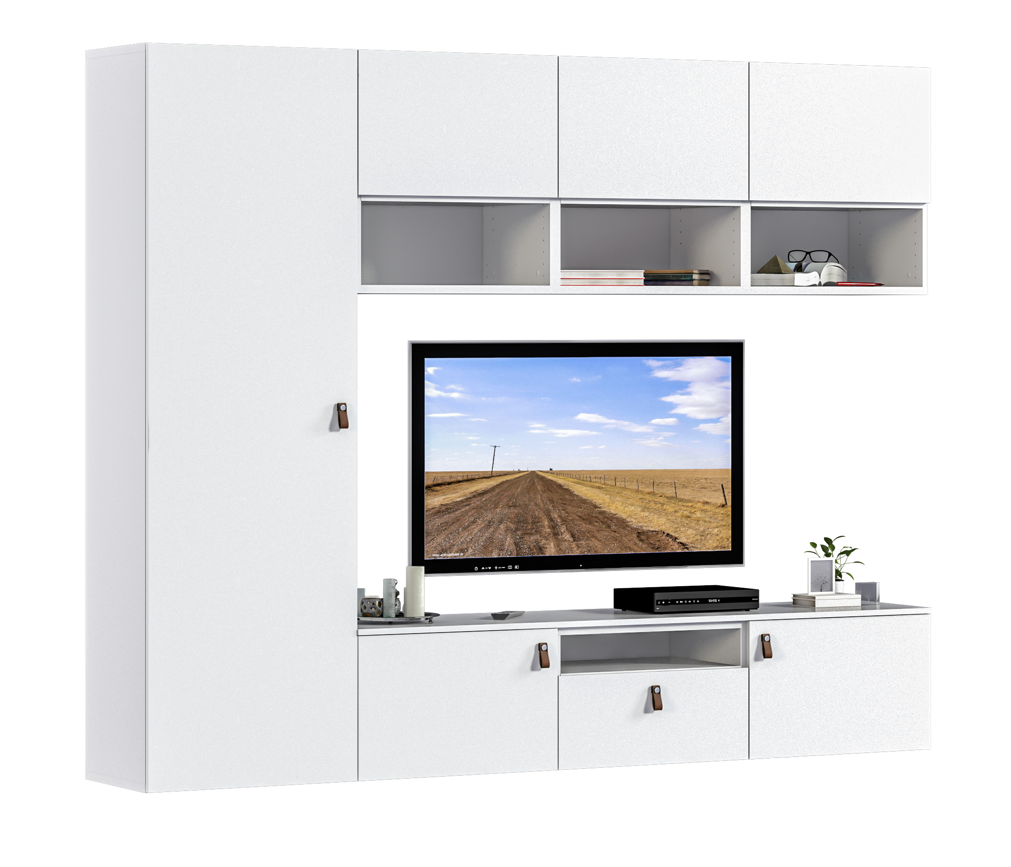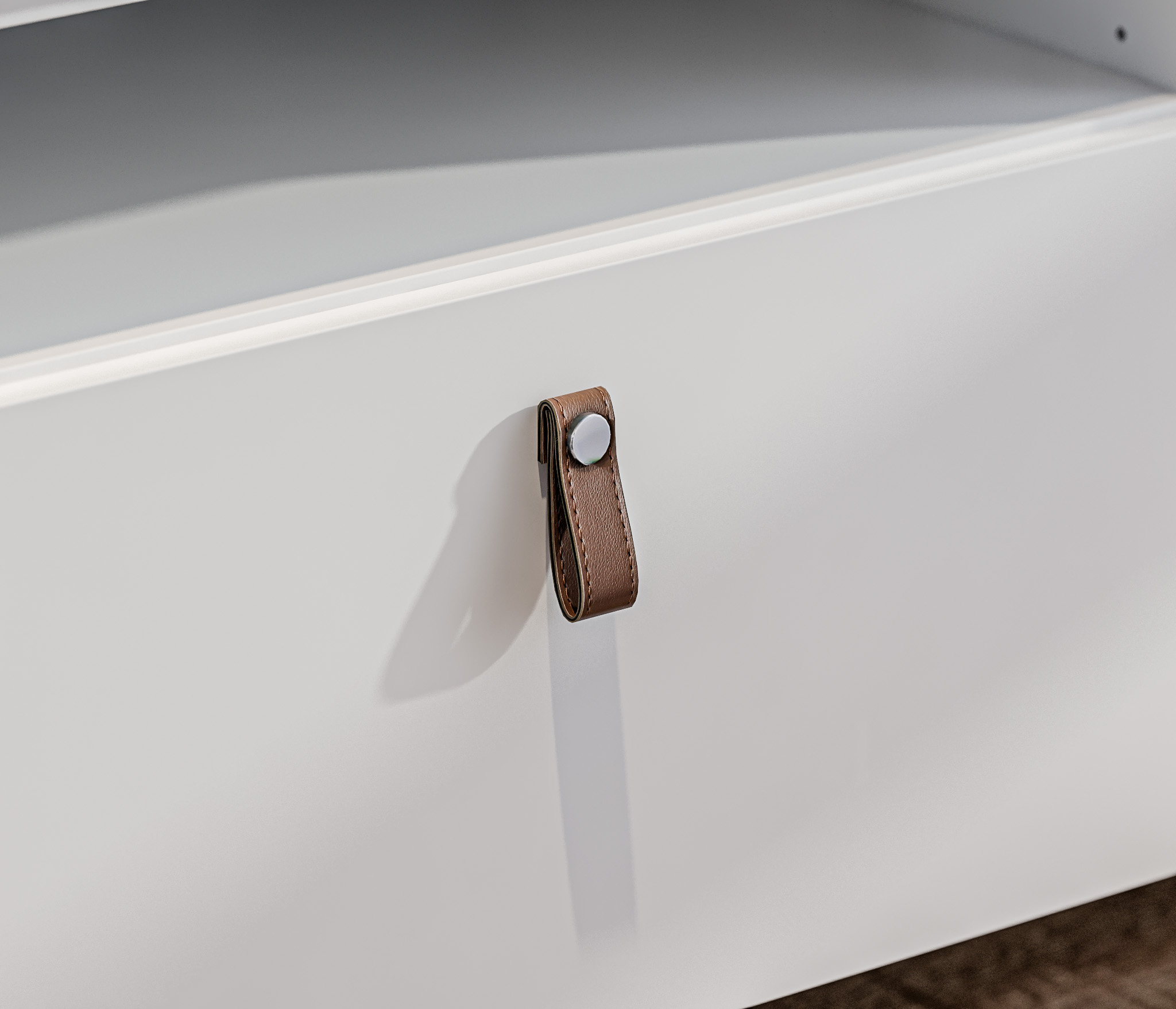 Выбор ручек является дополнительной опцией. В данной гостиной представлена ручка-кнопка в цвете хром/капучино для тумбы под телевизор и пенала, а верхняя полка оснащена механизмом Push To Open, который позволяет открывать ее легким нажатием.