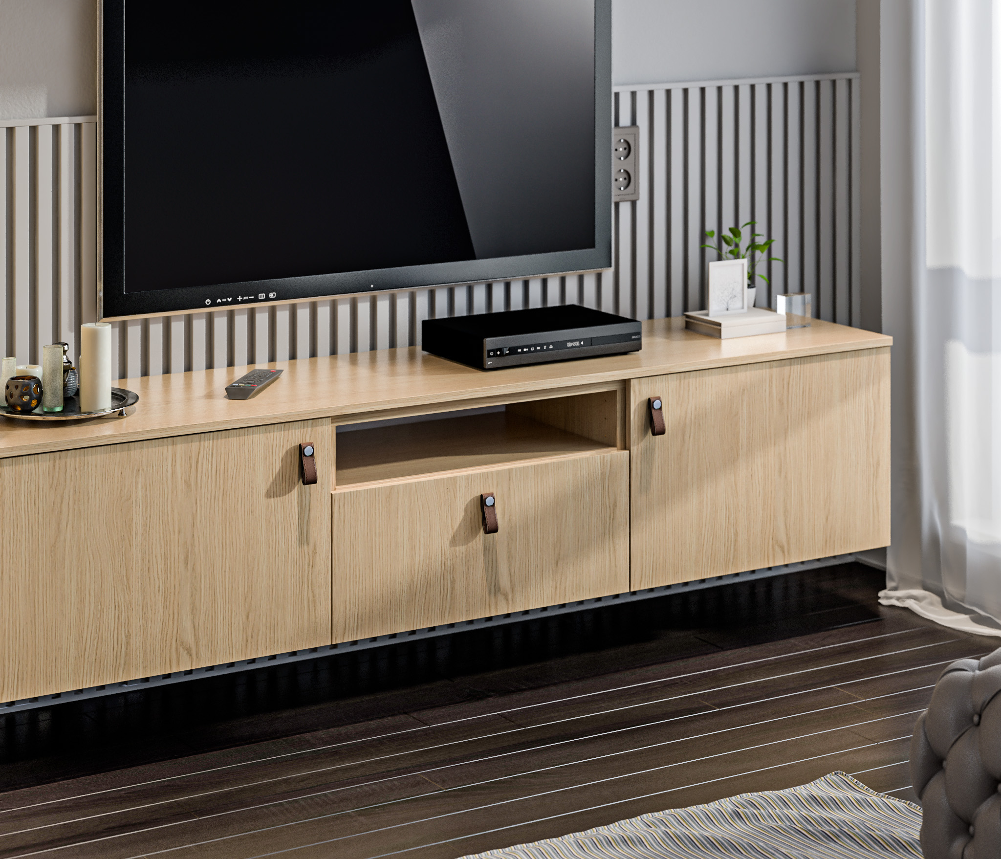 Выбор ручек является дополнительной опцией. В данной гостиной представлена ручка-кнопка в цвете хром/капучино для тумбы под телевизор и пенала, а верхняя полка оснащена механизмом Push To Open, который позволяет открывать ее легким нажатием.